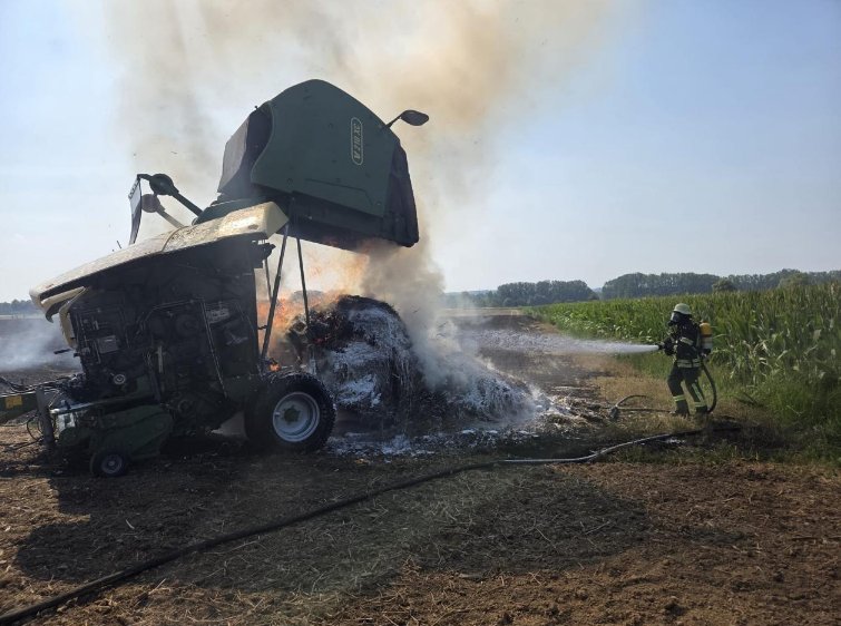 Am Dienstagnachmittag, gegen 15:00 Uhr, wurde in Augsburg-Göggingen im Bereich der Lindauer Straße eine brennende Ballenpresse gemeldet. Das Feuer griff rasch auf ein angrenzendes Stoppelfeld über und setzte rund 4 Hektar – also etwa 40.000 Quadratmeter – in Brand.