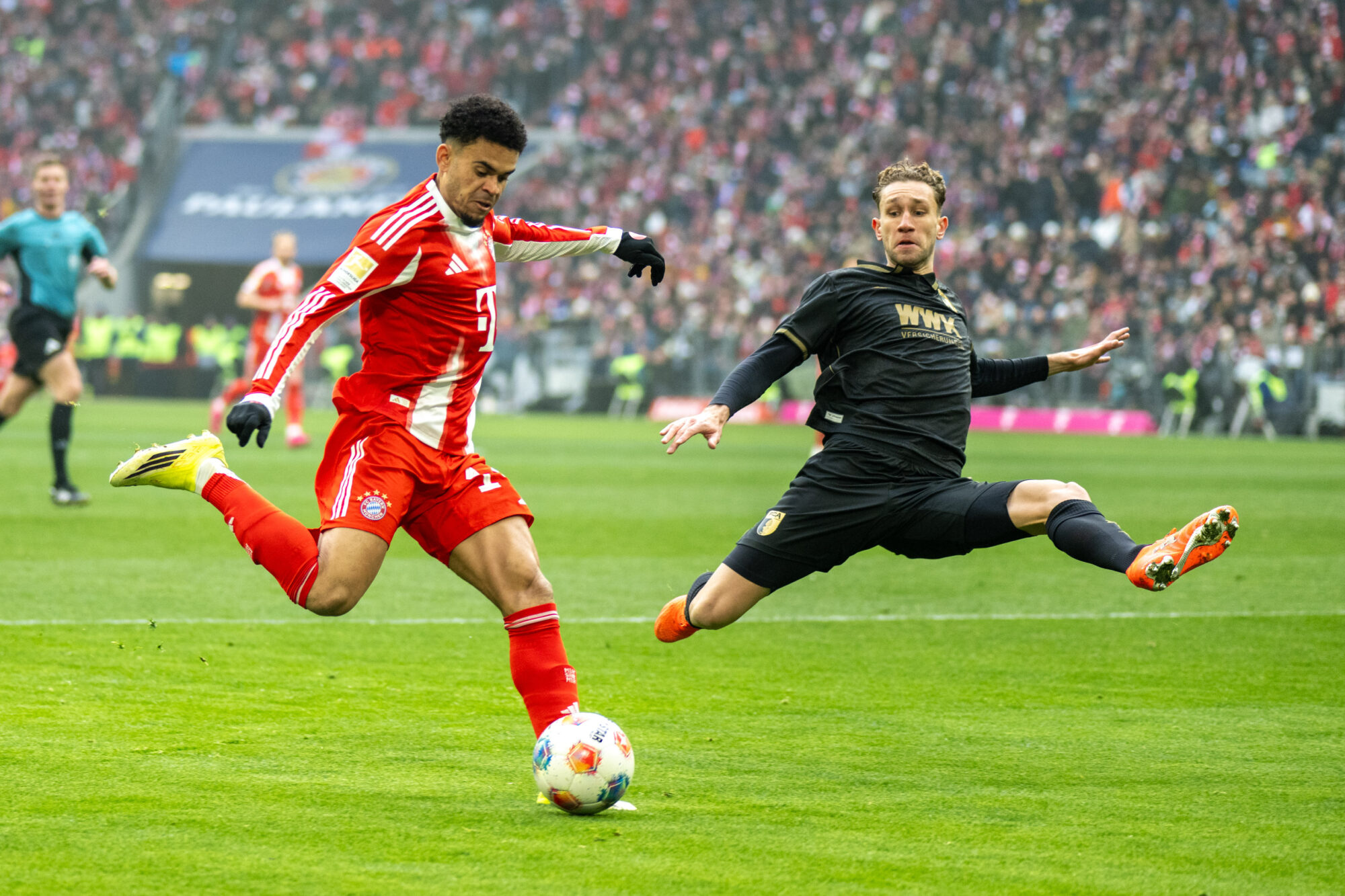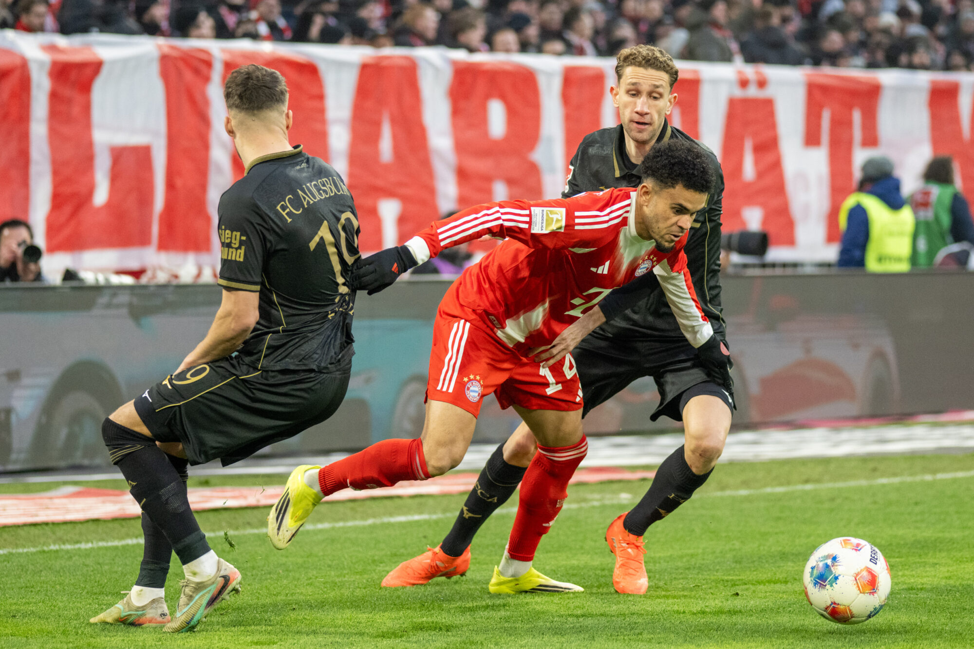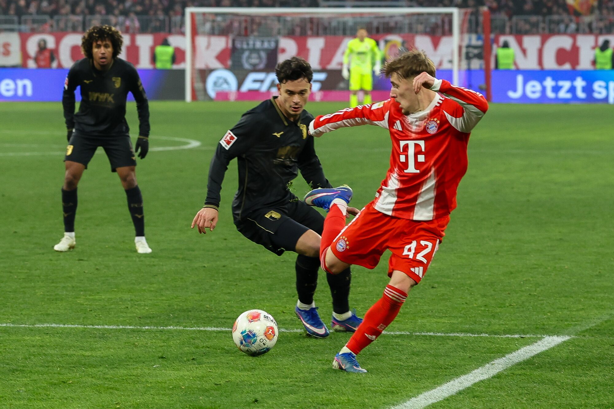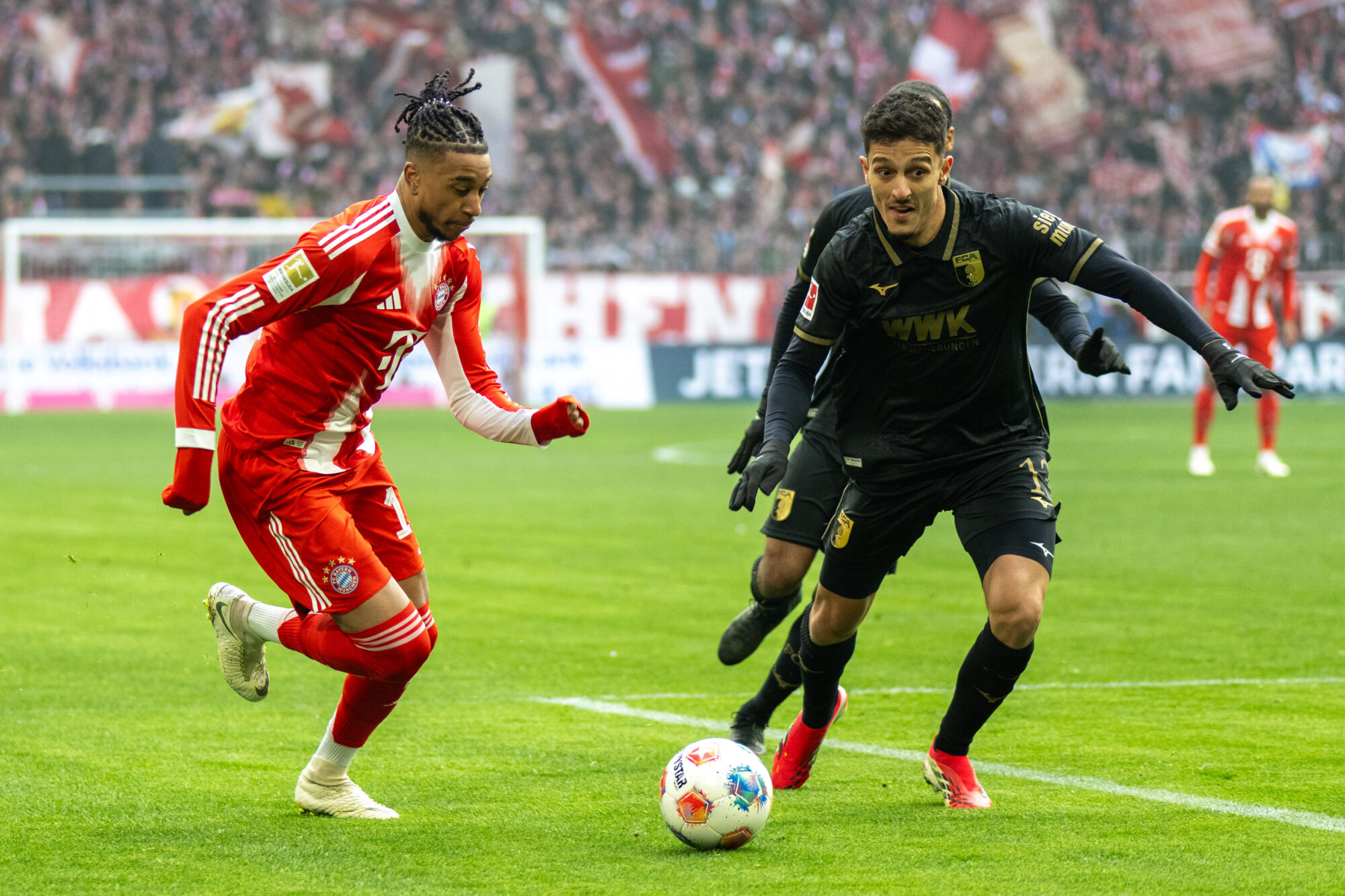 Augsburg blieb dran – und schlug erneut zu. Nur sechs Minuten später dribbelte sich Dimitrios Giannoulis auf der linken Seite durch und legte ins Zentrum, wo Han-Noah Massengo die Übersicht behielt und eiskalt zum 2:1 vollstreckte. Die Allianz Arena verstummte, während der Augsburger Gästeblock explodierte.
