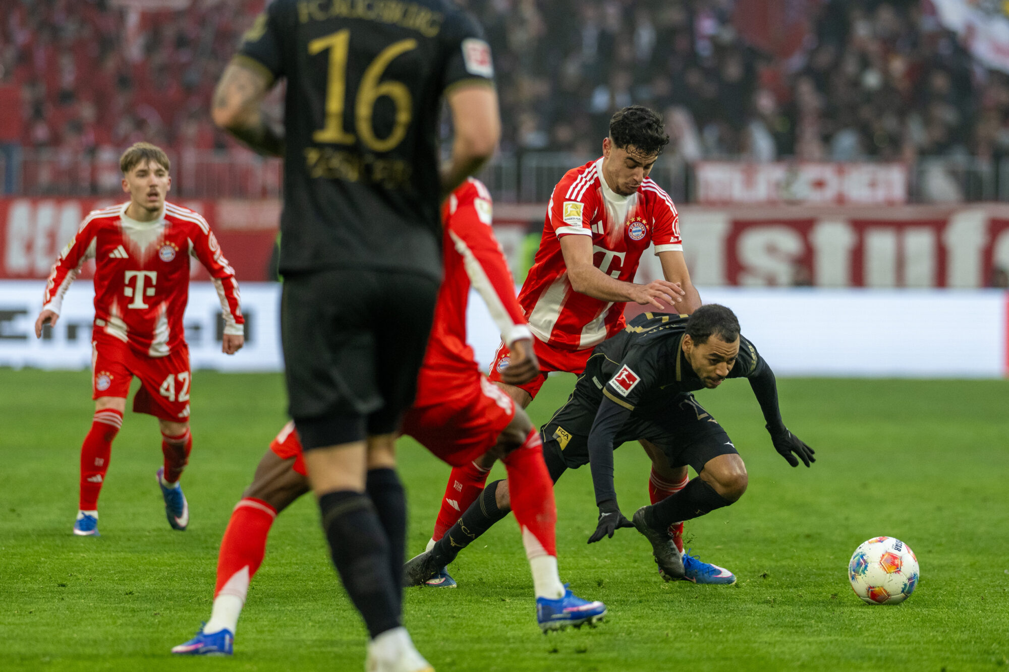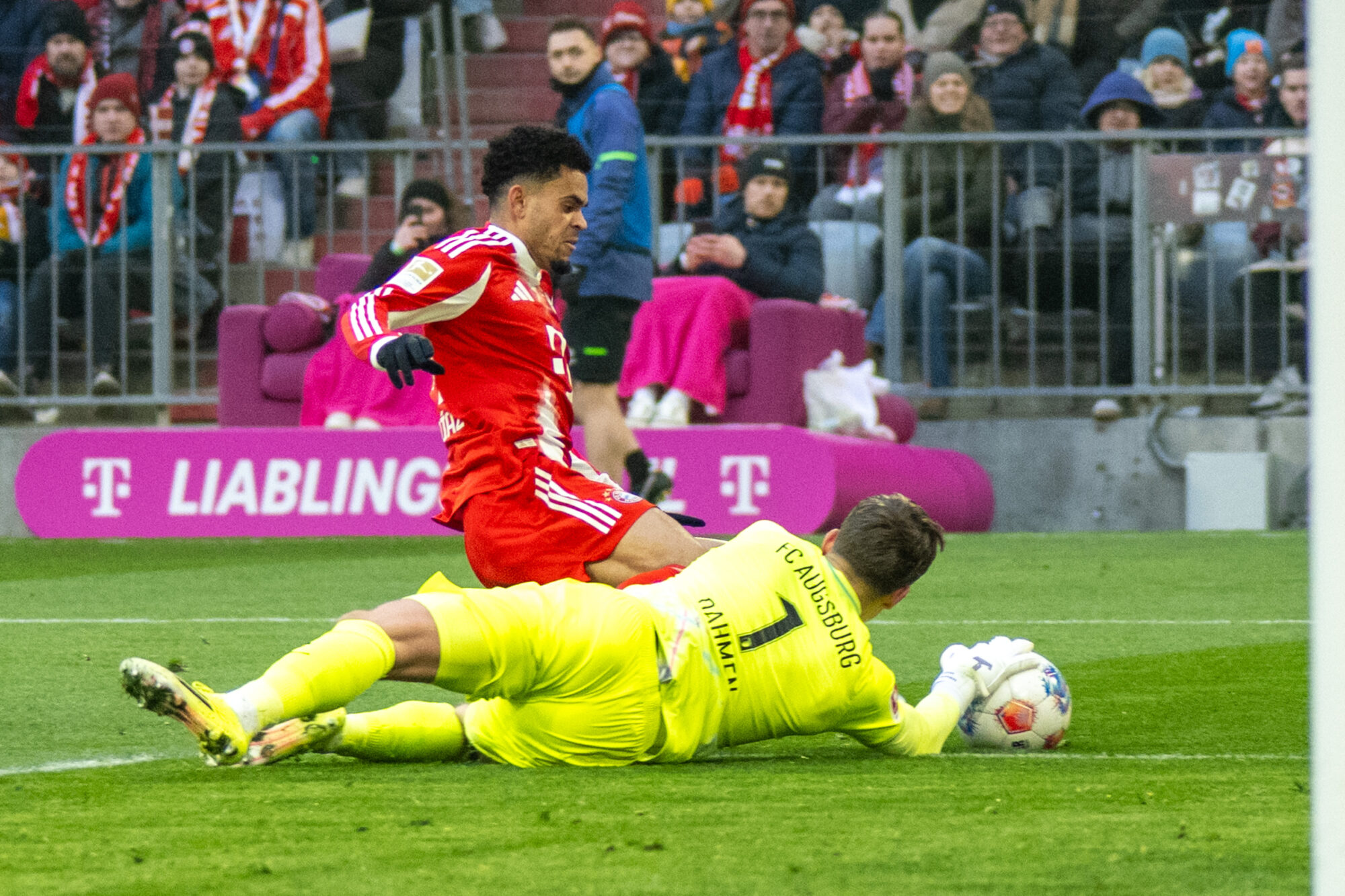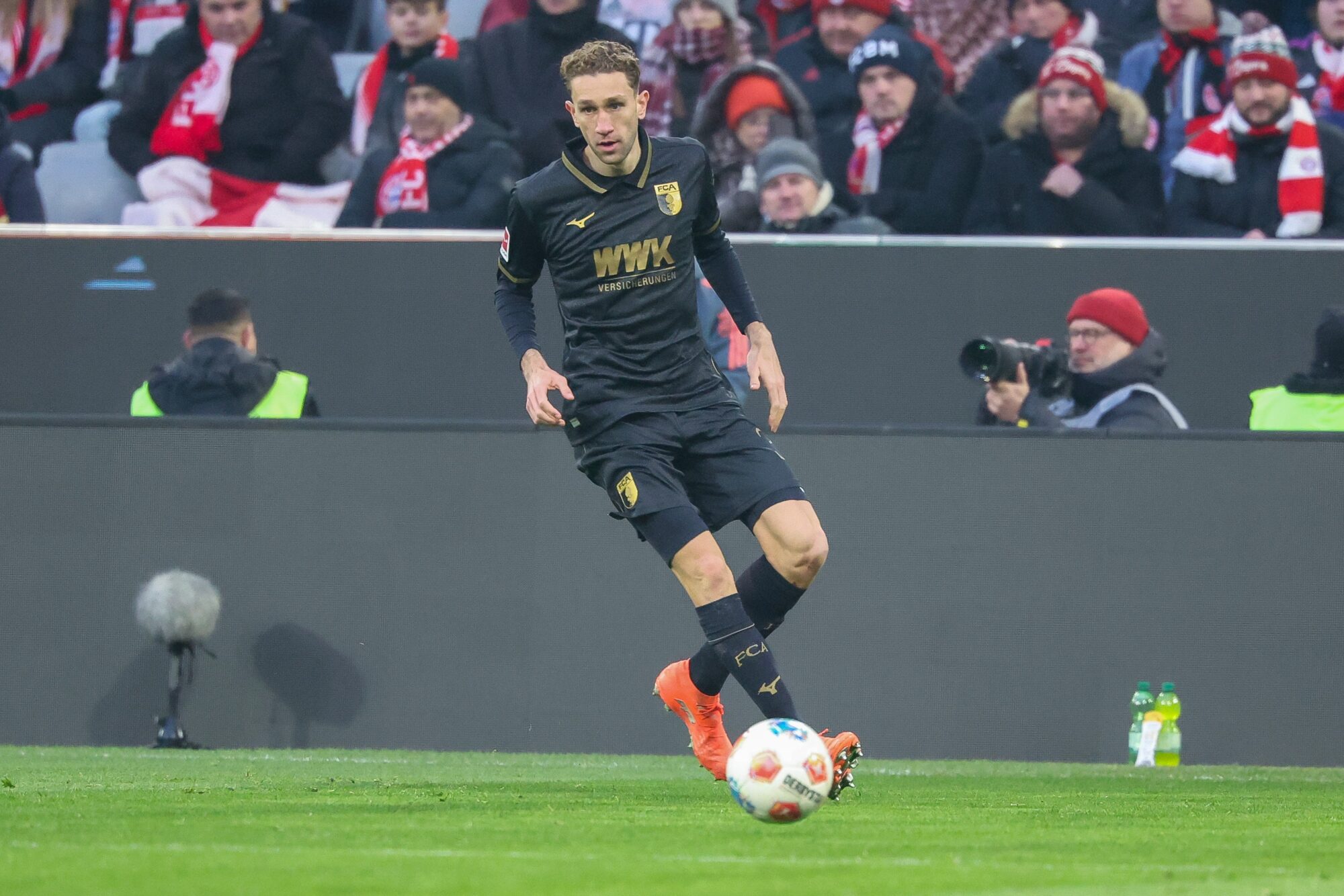 Augsburg blieb dran – und schlug erneut zu. Nur sechs Minuten später dribbelte sich Dimitrios Giannoulis auf der linken Seite durch und legte ins Zentrum, wo Han-Noah Massengo die Übersicht behielt und eiskalt zum 2:1 vollstreckte. Die Allianz Arena verstummte, während der Augsburger Gästeblock explodierte.