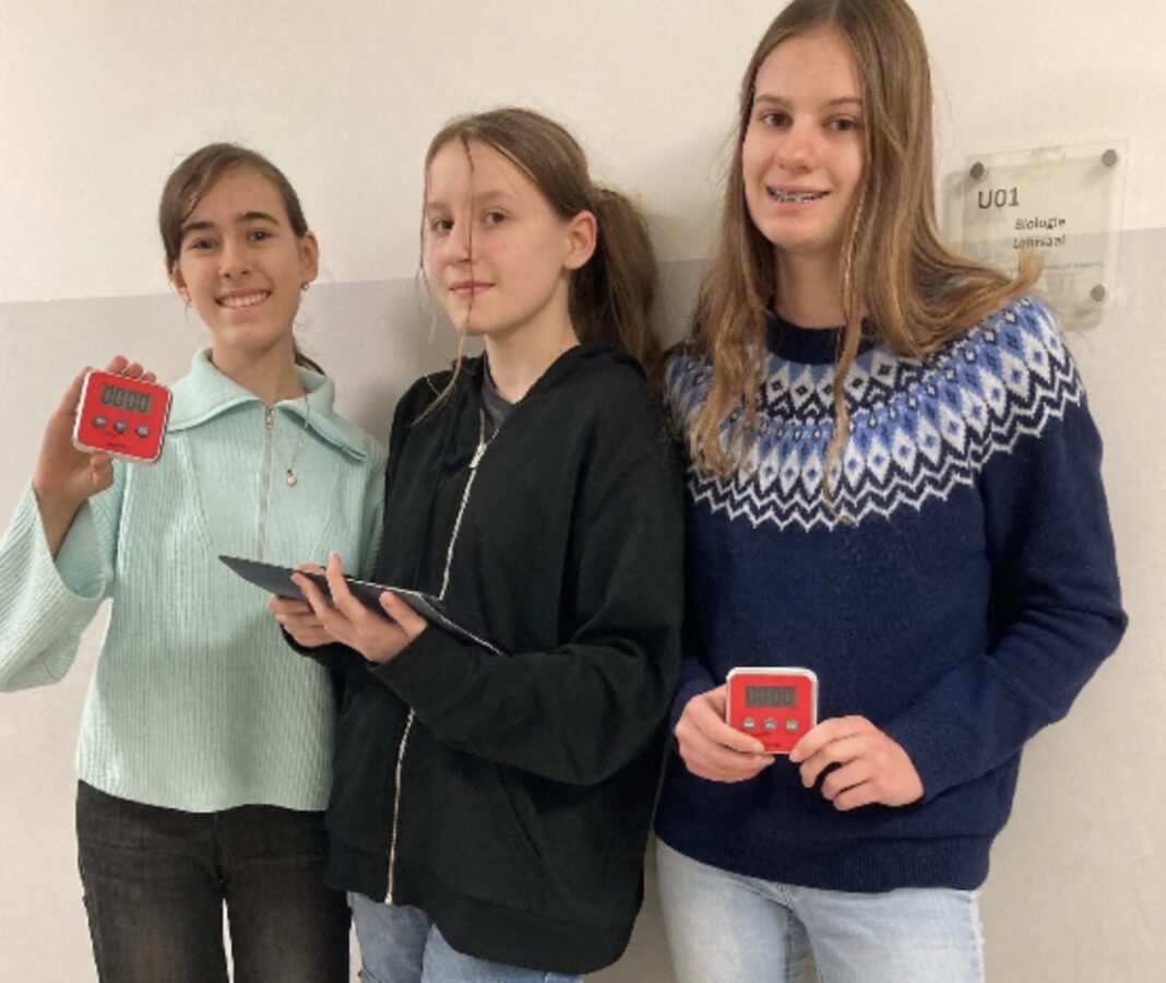 Zeitempfinden ist subjektiv und manchmal werden Minuten zu Stunden – zum Beispiel im Wartezimmer. Das wollten Paulina Hörmann, Sofia Zakirov und Magdalena Kern vom Maria-Ward-Gymnasium Augsburg ändern. Sie untersuchten, welche Einflüsse Zeit schneller verstreichen lässt. Dazu setzten die Schülerinnen Versuchspersonen unterschiedlichen Alters in einen Raum und ließen diese die Dauer einer Minute bzw. von fünf Minuten abschätzen. Die Probanden durften während dieser Zeit Musik hören, einen Dokumentarfilm ansehen oder verschiedene Aufgaben lösen. Erste Auswertungen lieferten unerwartete Erkenntnisse.