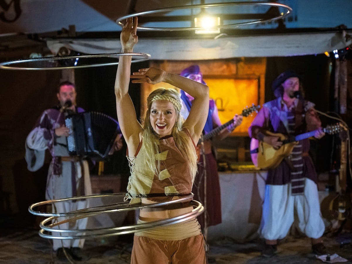 Musik gibt es auf Schloss Kaltenberg selbstverständlich nicht nur auf der Rabenbühne. Zahlreiche weitere Gruppen, unter anderem die legendären Streuner, die 2024 ihr 30. Bühnenjubiläum feiern, sind auf Schloss Kaltenberg zu hören. Wie die Spielleute setzen auch die Gaukler auf Schloss Kaltenberg Ausrufezeichen. Und dass nicht nur auf der Gauklernacht, mit der das Turnier traditionell eröffnet wird. Zum Markenzeichen des Kaltenberger Ritterturnier gehören immer wieder auch faszinierende exklusive Eigenproduktionen, die es nur hier zu sehen gibt. Bereits in der Spielzeit 2023 sorgte zum Beispiel der morbid-glamouröse „Kaltenberger Totentanz“ für Gänsehautmomente. In diesem Jahr wird die von Lidia Buonfino, Lova Rimini und Meike Münch federführend inszenierte Performance nicht nur ausgeweitet, sondern sogar in der Arena zu sehen sein.