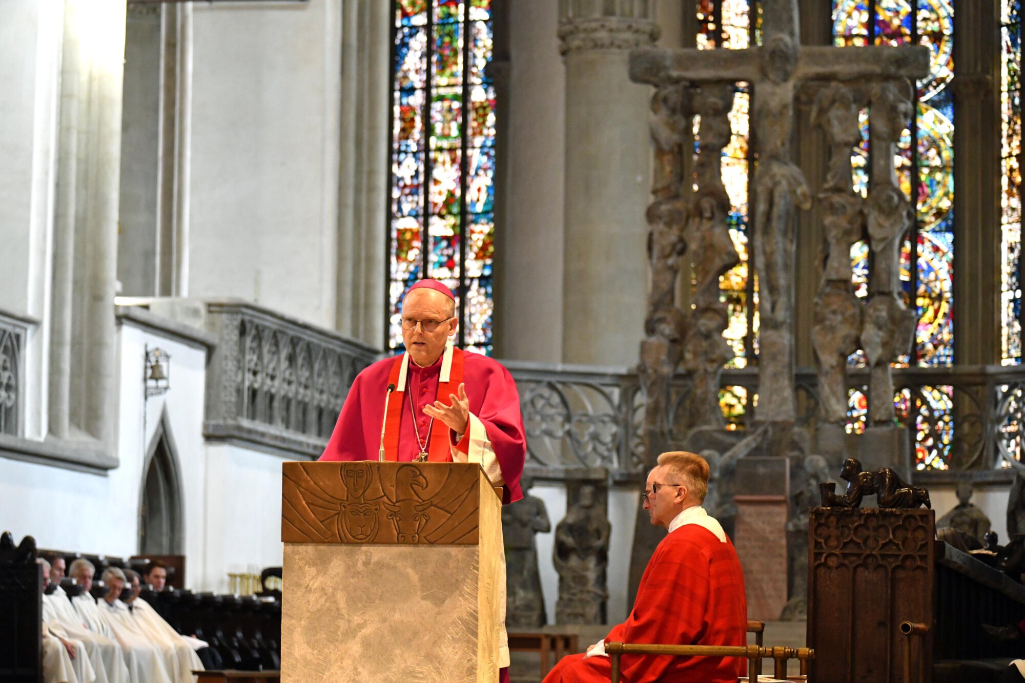 Musikalisch wurde die Feier vom Kammerchor der Augsburger Domsingknaben unter der Leitung von Domkapellmeister Stefan Steinemann sowie dem Domchor unter Leitung von Andreas Martin gestaltet. Die Passion nach dem Evangelisten Johannes, vertont von Matthias Deger, wurde von Solisten und Chor eindrucksvoll vorgetragen.