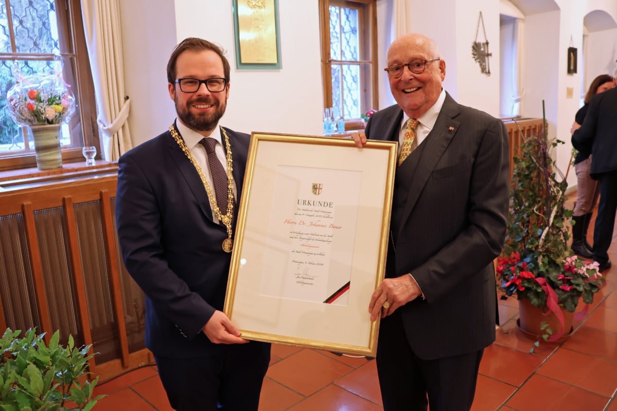 Von 1968 bis 1980 war Dr. Johannes Bauer Oberbürgermeister der Stadt Memmingen. Nach zwei erfolgreichen Amtsperioden trat der damals 42-Jährige nicht mehr zur Wahl an und richtete sich beruflich neu aus. „Altoberbürgermeister Dr. Johannes Bauer hat sich intensiv für Memmingen eingesetzt. Er hat viele wichtige Dinge auf den Weg gebracht hat, die heute die Stadt prägen. Er hat Themen intelligent, mutig und immer auch mit einem breiten Kreuz vorangebracht und war parteiübergreifend respektiert“, würdigte Oberbürgermeister Jan Rothenbacher den Geehrten und zeichnete Dr. Johannes Bauer bei einer Feierstunde im Rathaus mit dem Ehrentitel „Altoberbürgermeister“ aus.