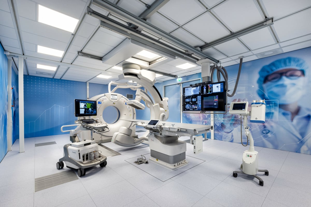 Für Canon Medical hat sich die Uniklinik als Partner entschieden, da das Unternehmen eine hohe Expertise in Angio-CT-Hybridsystemen hat. „CT und Angiographie müssen im wahrsten Sinne des Wortes miteinander reden, um die Arbeitsabläufe beider Großgeräte wirklich miteinander zu kombinieren. Das ist sehr anspruchsvoll und Canon hat hier überzeugende Lösungen“, erklärt der Radiologe. Zusätzlich wird ein leistungsfähiges Navigationssystem installiert werden, um den Weg insbesondere von Behandlungssonden für die Krebstherapie zum Zielort zu planen und anzuzeigen. Damit kann die Steuerung, die bisher kognitiv und händisch erfolgte, noch präziser werden. „Mithilfe der computerassistierten Stereotaxie wird die Lokalisation auf ein neues Level gehoben“, so Kröncke weiter. Bei herkömmlichen Installationen wurden in der Vergangenheit zuerst für die Diagnostik ein CT-Scan in einem Raum und anschließend in einem weiteren der Eingriff, die eigentliche Behandlung durchgeführt. Dies benötigt Zeit und ist risikoreich, da die Patientinnen und Patienten in der Regel anästhesiert und Transportwege zwischen den Räumen erforderlich sind. Mit dem neuen Hybrid-Angio-CT wird das nun anders: In einem Raum wird die Diagnose gestellt und unmittelbar danach die Behandlung geplant, durchgeführt und überprüft. „Damit können wir besser, schneller und effektiver Patienten versorgen“, erklärt Kröncke.