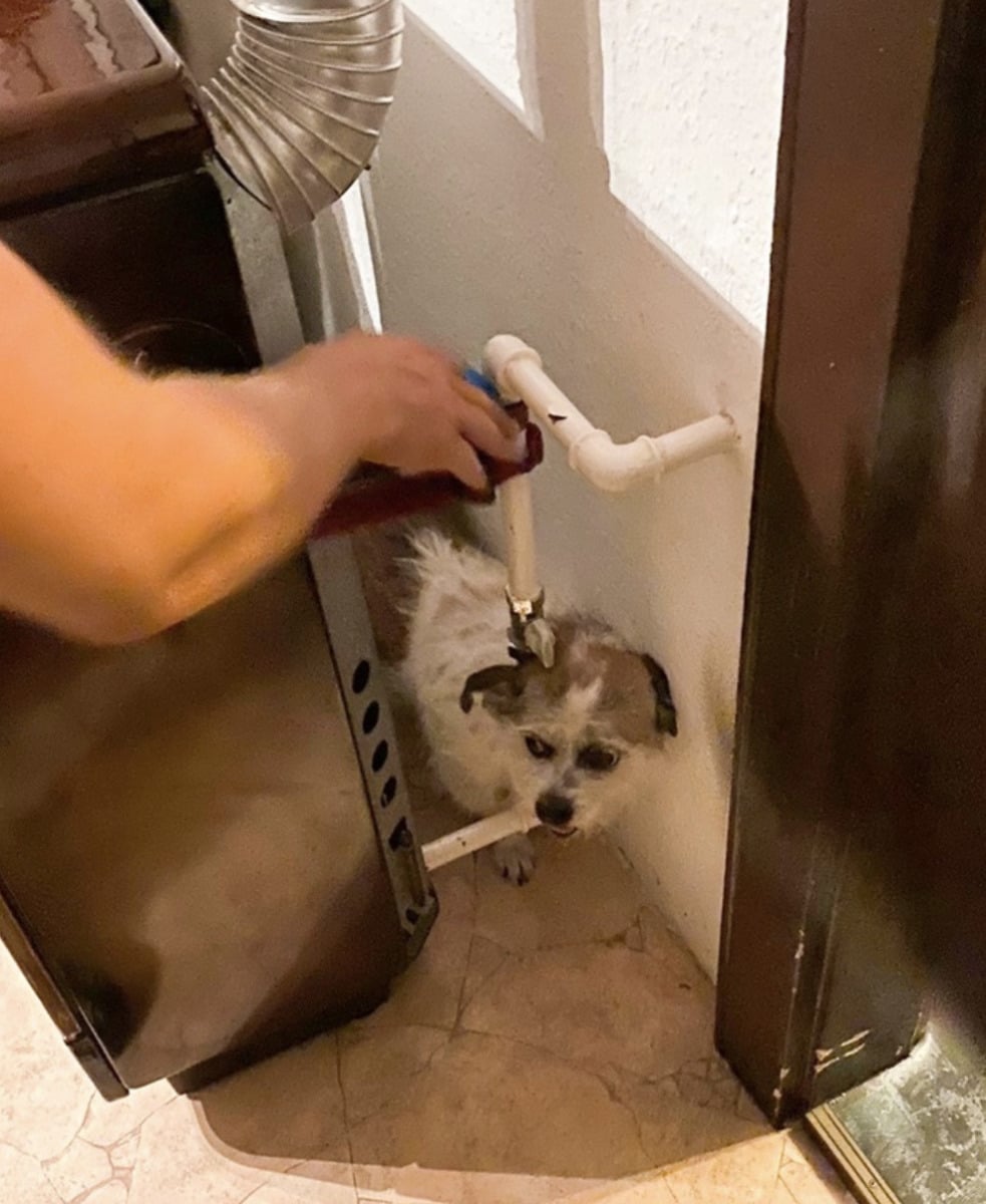 Die Leitstelle schickte ein Hilfeleistungslöschfahrzeug zur Einsatzstelle. Die Einsatzkräfte beruhigten zuerst alle Beteiligten und erkundeten die Lage des kleinen Rocky und wie eine Rettung am besten möglich ist. Dabei wurde das Tier beruhigt und gestreichelt. Mit einem speziellen Feuerwehrbrechwerkzeug setzten die Feuerwehrleute schließlich am Heizungsrohr an, um es ganz vorsichtig etwas zur Seite zu biegen. Ein Feuerwehrmann zog zeitgleich die Füße des Hundes weg, damit dieser nach unten rutschte. So konnte Rocky aus seiner Einklemmung befreit werden. Nach einem kurzen Check war klar, der Hund ist unverletzt.