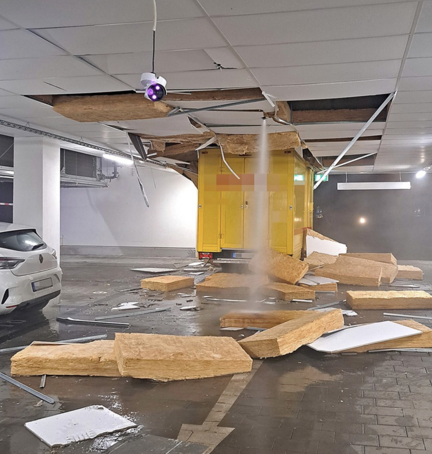 Vor Ort bot sich jedoch ein völlig unerwartetes Bild: Der Fahrer eines Kleintransporters hatte die Warnhinweise zur Deckenhöhe der Tiefgarage ignoriert und riss auf einer längeren Strecke mehrere Sprinklerköpfe sowie Teile der Decke herunter. Seine Fahrt endete schließlich an der massiveren Ausfahrt der Tiefgarage. Glücklicherweise blieb der Fahrer unverletzt.