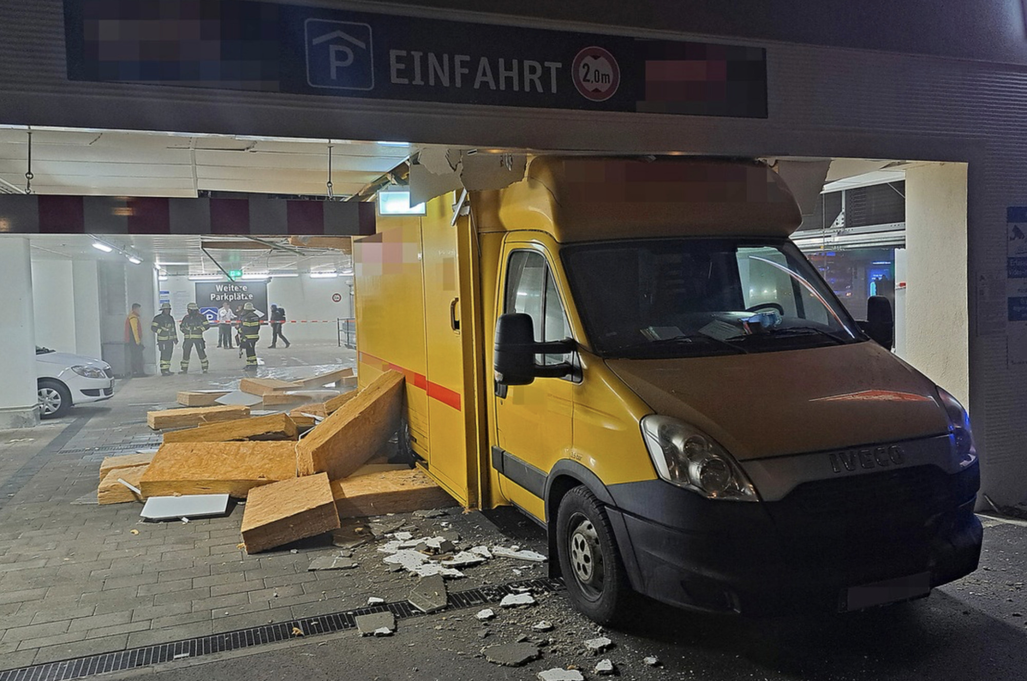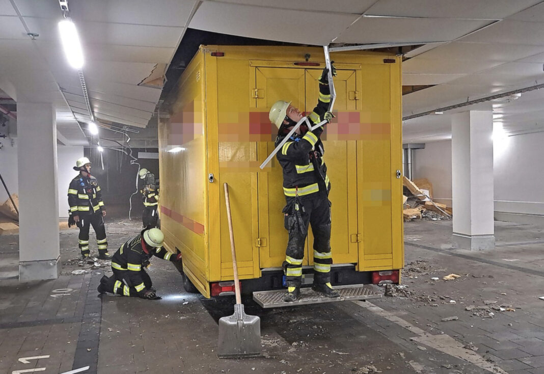 Zur Bergung des verkeilten Fahrzeugs entschieden sich die Einsatzkräfte, die bereits beschädigte Decke der Tiefgarage teilweise zu demontieren. Nur so konnte der Transporter den Weg zurück aus der Tiefgarage antreten, ohne weiteren Schaden an Gebäude oder Fahrzeug zu verursachen.