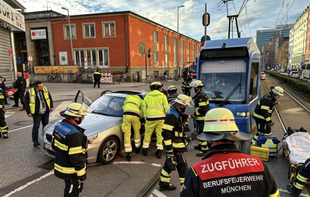 Der BMW-Fahrer fuhr mit seiner Beifahrerin stadtauswärts, als er plötzlich eine schwere internistische Erkrankung erlitt. Zeitgleich fuhr die Fahrerin einer Tram ebenfalls stadtauswärts. Der 55-Jährige verlor die Kontrolle über sein Fahrzeug und geriet mit der Fahrerseite vor die Schnauze der Tram. Die Tramfahrerin leitete sofort eine Gefahrenbremsung ein, jedoch konnte sie den Zusammenstoß nicht mehr verhindern. Die Beifahrerin sowie die Insassen der Tram und die Tramfahrerin blieben unverletzt. Der BMW-Fahrer wurde im Fahrzeug eingeschlossen. Die Einsatzkräfte der Feuerwehr mussten mit hydraulischen Rettungsgeräten zwei Türen des BMW entfernen. Das Rettungsdienstpersonal versorgte den Mann und rettete ihn aus dem Fahrzeug. Nach einer kurzen medizinischen Versorgung im Rettungswagen musste er schwer verletzt in den Schockraum einer Münchner Klinik transportiert werden. Die Beifahrerin sowie die Tramfahrerin wurden vom Kriseninterventionsteam betreut.