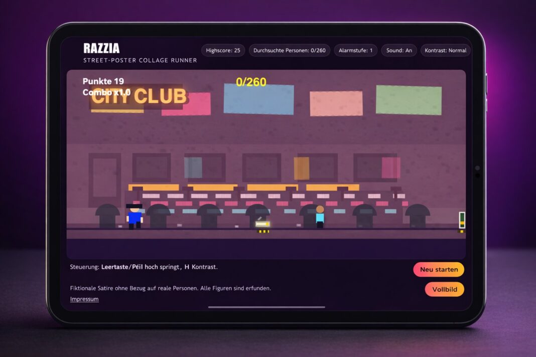 Visuell und musikalisch bedient sich „RazziA“ bewusst überzeichneter Elemente aus der Club- und Gaming-Kultur. Das Spiel läuft direkt im Browser und ist ohne Installation unter razz-i-a.de spielbar.