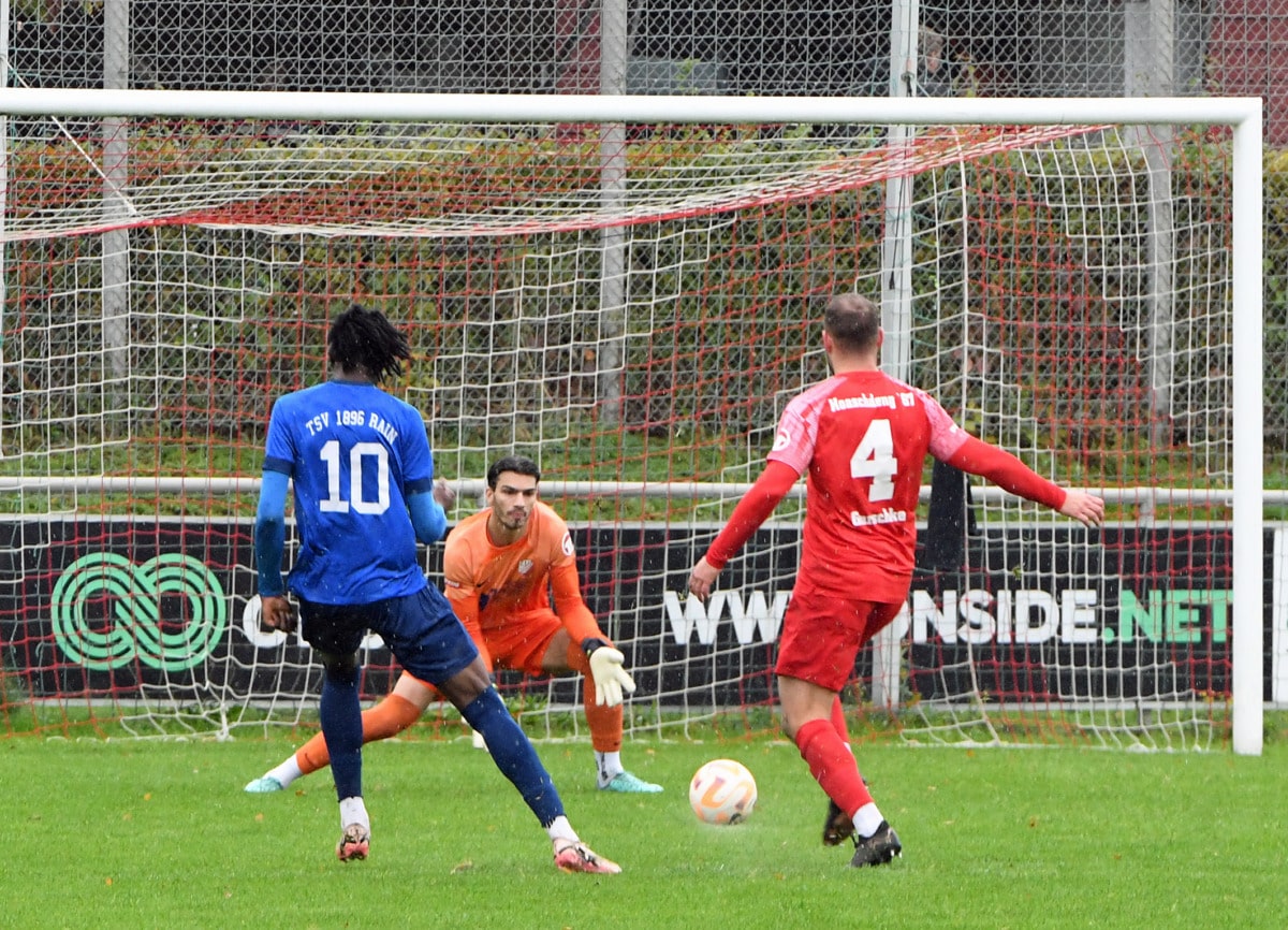 Im ATS-Sportpark wurde die Partie bei regnerischen Bedingungen von Schiedsrichter Maximilian Baier angepfiffen, und beide Teams hatten zunächst mit dem nassen Rasen zu kämpfen. Die erste nennenswerte Torchance gehörte den Hausherren, als Lukas Riglewski mit einem Schuss Fabian Eutinger im Rainer Tor prüfte. Nach 17 Minuten dann die erste Möglichkeit für die Gäste: Leo Hass bediente den mitgelaufenen Marc Sodji, dessen Abschluss jedoch harmlos blieb. Mit fortschreitender Spieldauer übernahm Heimstetten das Kommando, ohne jedoch zunächst wirklich gefährlich zu werden. Doch in der 30. Minute hätte Rain überraschend in Führung gehen können: Bryan Stubhan drang von der linken Seite in den Strafraum ein, legte quer auf Sami Achir, aber Heimstettens Keeper Fabio Rasic ahnte das Zuspiel und fing den Ball ab. Diese vergebene Chance markierte den Wendepunkt des Spiels – von da an geriet Rain komplett aus dem Tritt. In der 34. Minute nutzte Jordi Woudstra die Passivität der Rainer Abwehr eiskalt aus und brachte die Gastgeber mit einem platzierten Schuss ins lange Eck in Führung. Ein einziger Pass genügte, um die Abwehr auszuhebeln. Nur fünf Minuten später erhöhte Filip Vnuk auf 2:0, als er völlig unbedrängt aus kurzer Distanz einschieben konnte. Kurz vor der Halbzeit setzte Lukas Riglewski mit einem Flachschuss aus 16 Metern zum 3:0 nach, und die überforderte Rainer Hintermannschaft präsentierte sich einmal mehr als anfällig. Danach pfiff der Schiedsrichter zur Halbzeitpause.