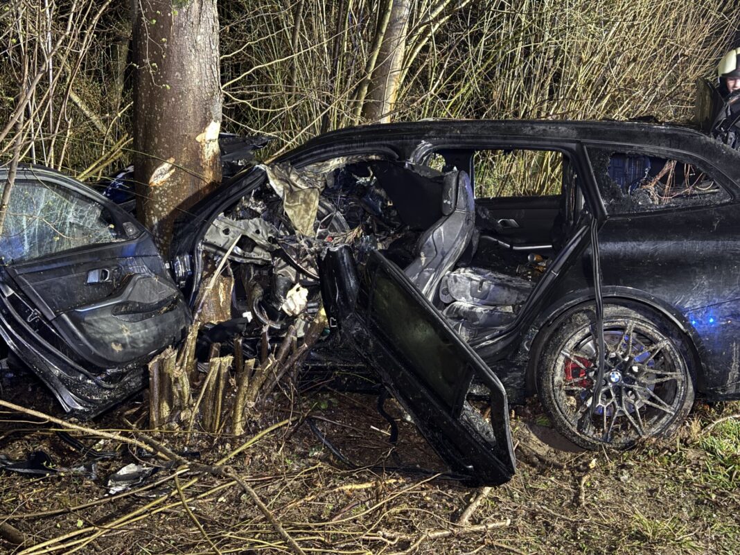 Mitten im Waldstück zwischen der Staustufe Bergheim und Grünau endet ein Überholmanöver am späten Mittwochabend (28.03.2025) gegen 22:30 Uhr in einer Katastrophe. Ein PS-starker BMW M3 kommt nach zwei Überholmanövern von der regennassen St2043 ab. Das hochmotorisierte Fahrzeug donnert durch einen Grünstreifen, überquert einen Fuß- und Radweg und prallt mit voller Wucht nacheinander gegen zwei Bäume.