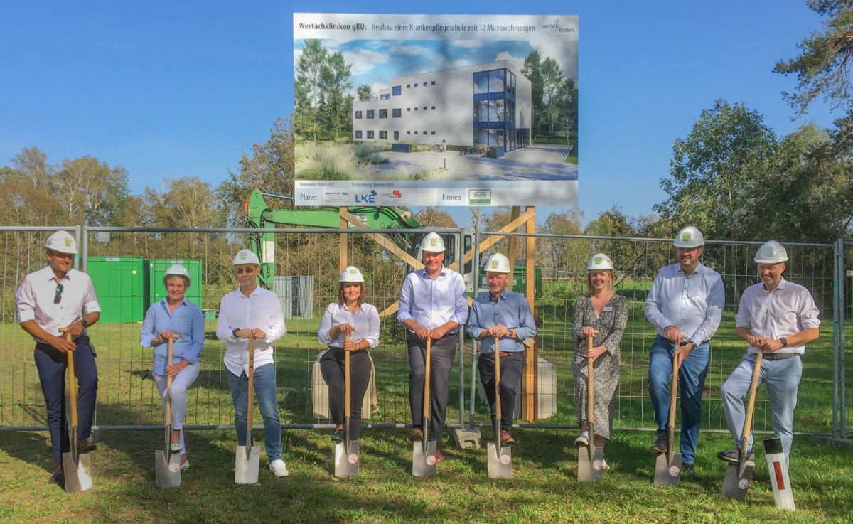 In dem Neubau in umweltfreundlicher, modularer Bauweise wird es neben neuen Unterrichtsräumen und einer großzügigen Bibliothek auch zwölf Mikrowohnungen für Auszubildende geben. Bobingens Bürgermeister Klaus Förster nahm als Vertreter der beiden städtischen Träger zum Start des Neubaus einen Spaten in die Hand. „Für die Bürger der Städte Bobingen und Schwabmünchen und des ganzen südlichen Landkreises, aber auch für mich ganz persönlich, ist die hohe Qualität der wohnortnahen medizinischen Versorgung durch die Wertachkliniken sehr wichtig“, sagte er und betonte: „Diese gibt es nur mit gut ausgebildeten Pflegekräften.“
