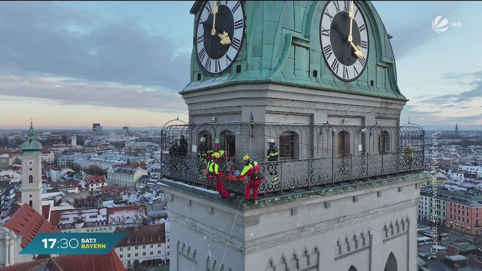 Spektakuläre Rettung am Alten Peter in München: Eine 35-Jährige stürzte beim Abstieg von der Aussichtsplattform und verletzte sich schwer. Die Feuerwehr brachte sie über eine 60 Meter lange Seilrutsche zu Boden und anschließend in eine Klinik.