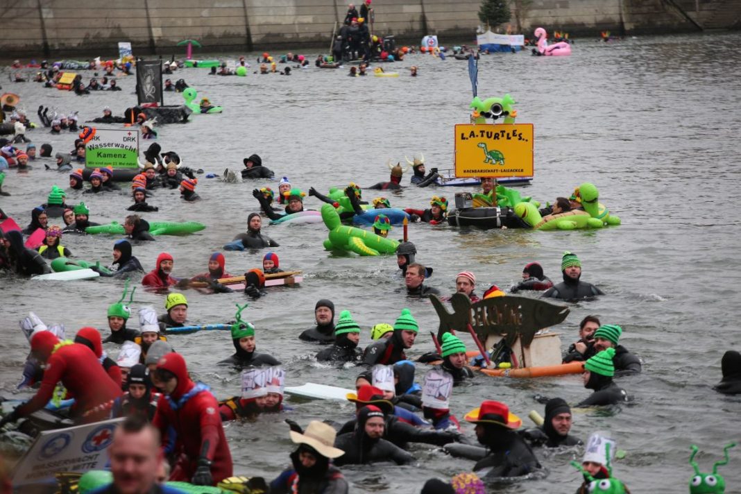 Die hartgesottenen Schwimmer legen die vier Kilometer lange Schwimmstrecke von der Staustufe Bittenbrunn entlang der imposanten Renaissancekulisse bis zum Ruderclub, bunt kostümiert und mit fantasievollen Wassergefährten ausgestattet, zurück. Was 1970, als acht Wasserwachtmitglieder aus Spaß den Eistest wagten begann, hat sich heute zu Europas größtem Winterschwimmen entwickelt.