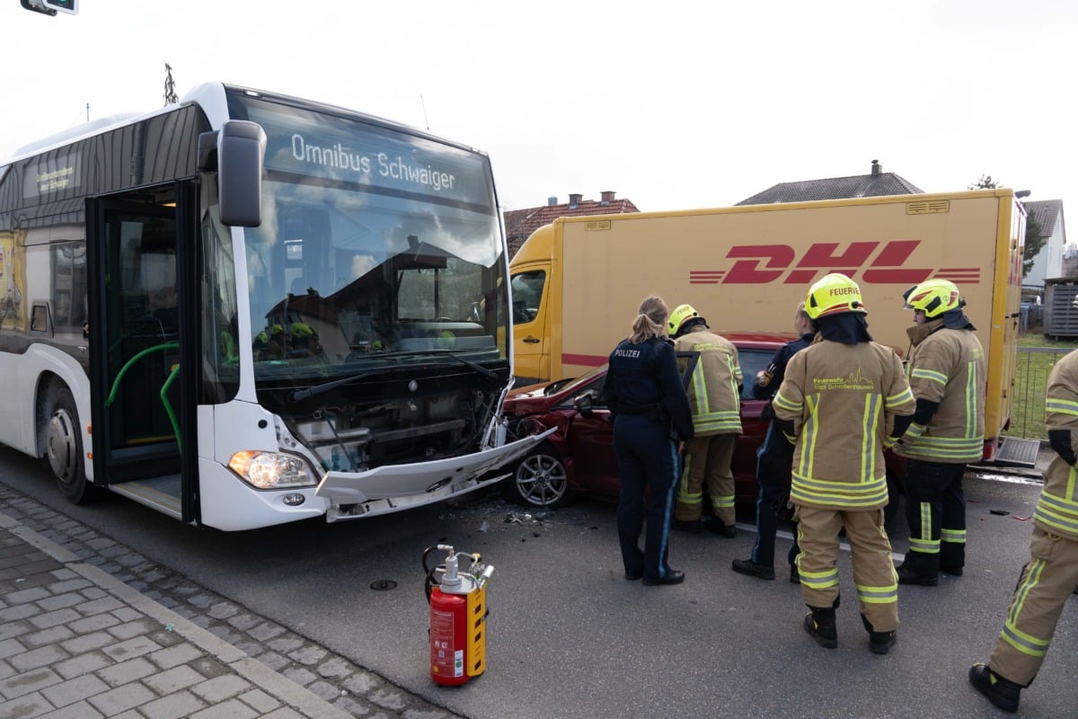 Nach ersten Informationen von der Unfallstelle, wollte ein Autofahrer einen parkenden Pakettransporter umfahren. Dabei kam es zur seitlich-frontalen Kollision mit einem entgegenkommenden Linienbus. Dieser war glücklicherweise bis auf den Fahrer unbesetzt. Eine Person trug durch den Zusammenstoß Verletzungen davon. Der Rettungsdienst brachte diese nach einer medizinischen Erstversorgung zur weiteren Behandlung in ein Krankenhaus. Die alarmierte Feuerwehr stellte den Brandschutz sicher. Wie hoch der entstandene Sachschaden ist, war vor Ort noch nicht zu erfahren.