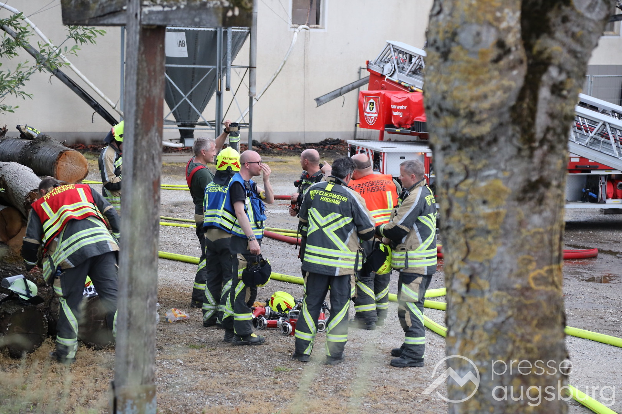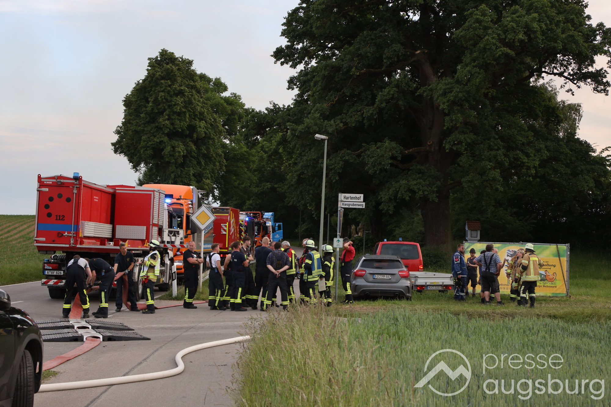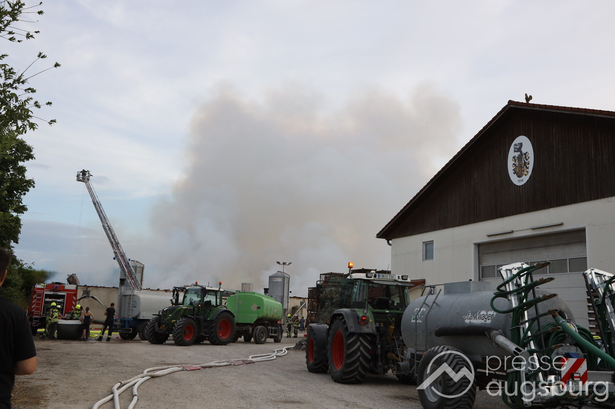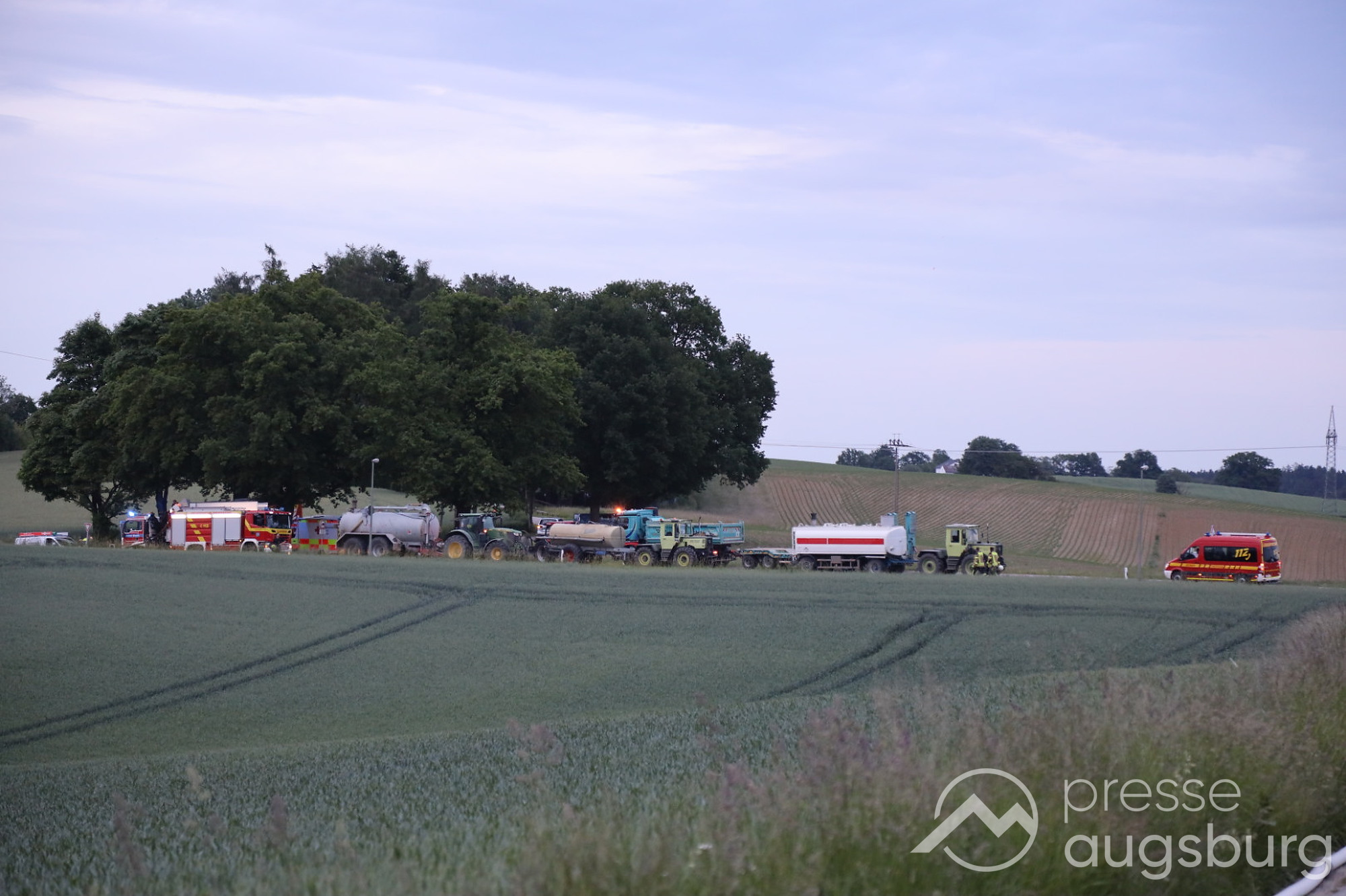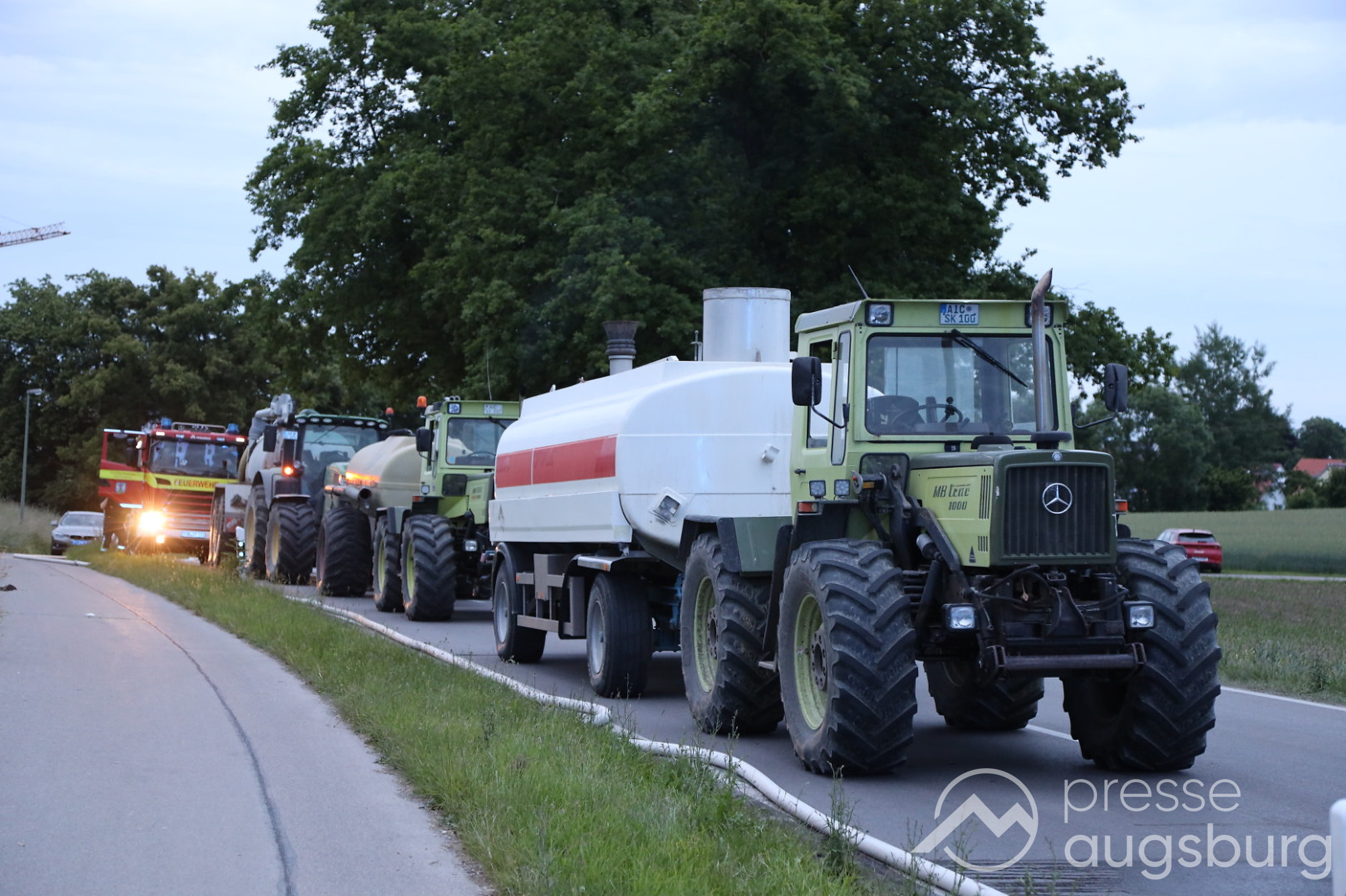 Unterstützung erhielten die Einsatzkräfte nicht nur von rund 180 Feuerwehrleuten aus mindestens acht umliegenden Wehren – darunter Wulfertshausen, Kissing, Aichach, Friedberg, Ottmaring, Haunswies sowie der Berufsfeuerwehr Augsburg – sondern auch von umliegenden Landwirten, die mit Wasserfässern aushalfen.