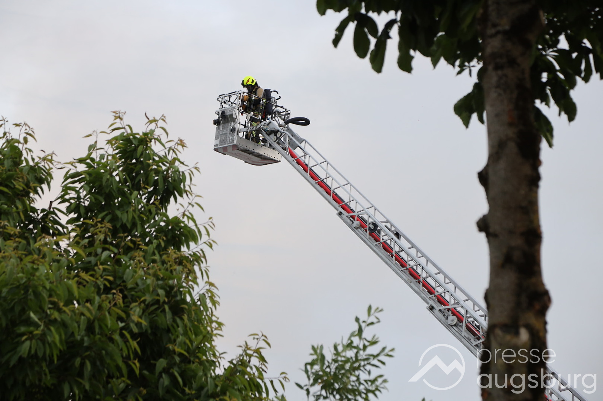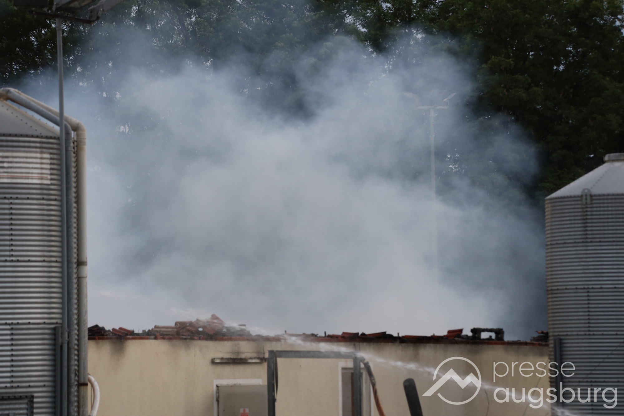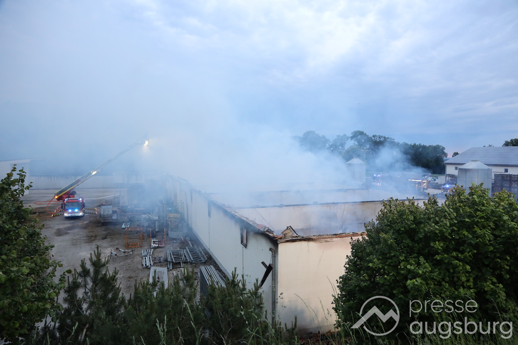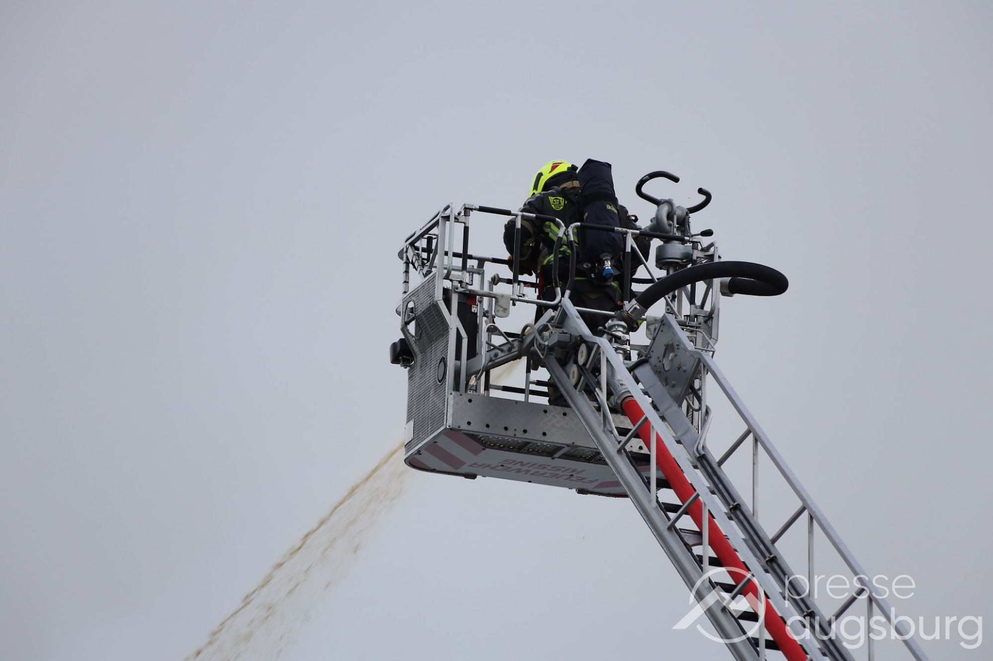 Da das Hallendach während der Löscharbeiten einstürzte, war ein Innenangriff nicht mehr möglich. Die Feuerwehr setzte daher zwei Drehleitern mit sogenannten Zangenangriffen ein, um das Feuer von außen zu bekämpfen. Zahlreiche Schlauchleitungen mussten über große Distanzen verlegt werden. Auch ein Spezialfahrzeug der Berufsfeuerwehr Augsburg kam zum Einsatz.