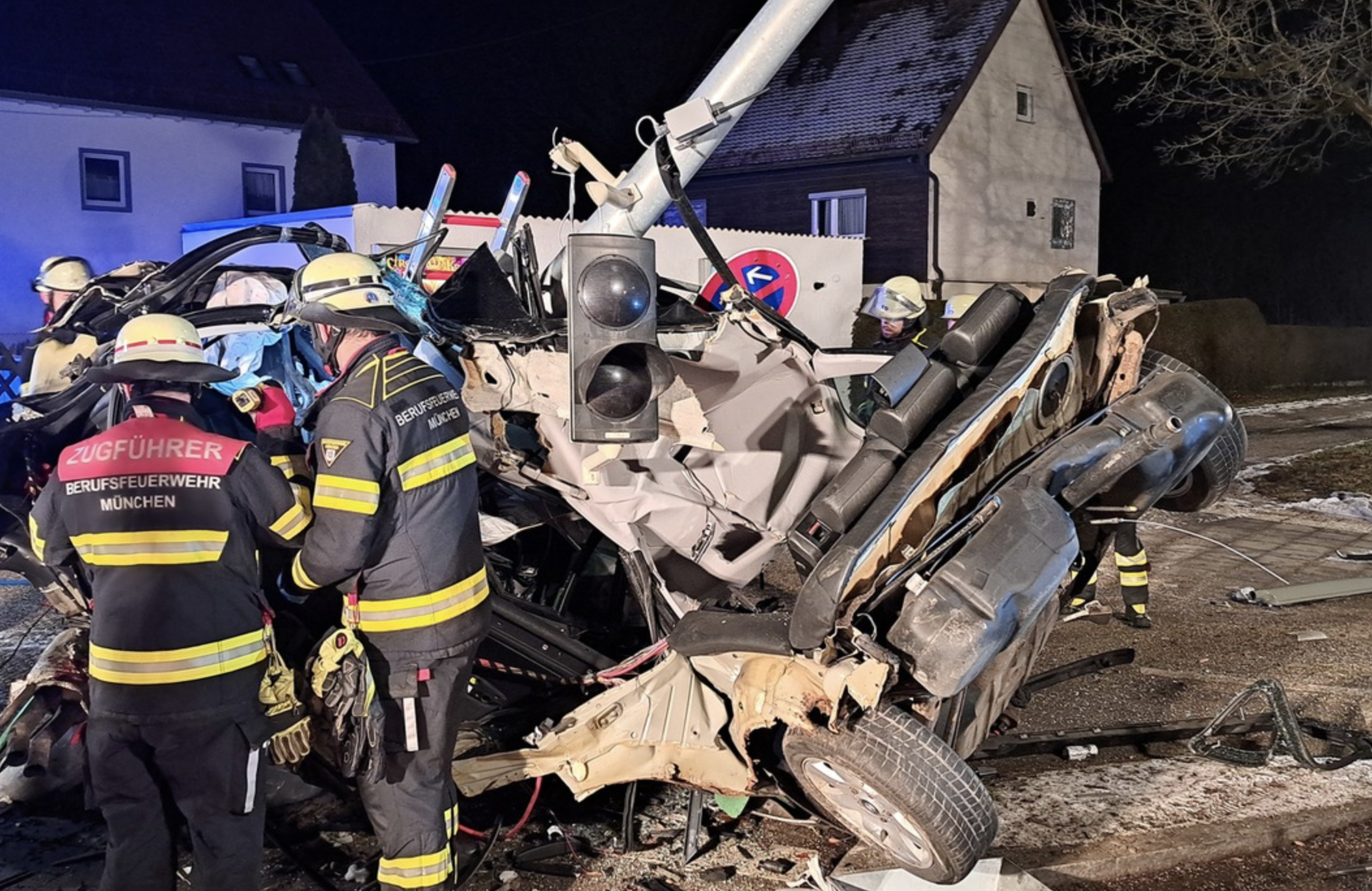 Die Integrierte Leitstelle alarmierte Feuerwehr und Rettungsdienst, die schnell vor Ort waren. Das Ausmaß des Unfalls war sofort erkennbar: Der BMW des jungen Mannes hatte sich um einen Ampelmast gewickelt. Zur Rettung des Fahrers war schweres technisches Gerät erforderlich.