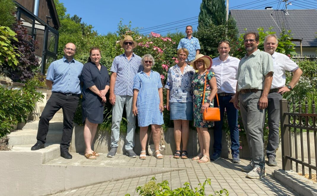 Volker Bertram und Reinhold Jungwirth, Augsburger Str. 29–31, 86470 Thannhausen: Terrassierter Hanggarten (300 m²), seit 2019 neugestaltet, mit Brunnen, Sitzbereichen, Gewächshäusern, Mauern und Themenbereichen (barrierefrei).