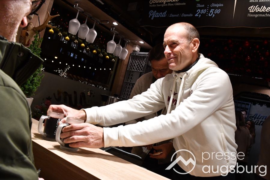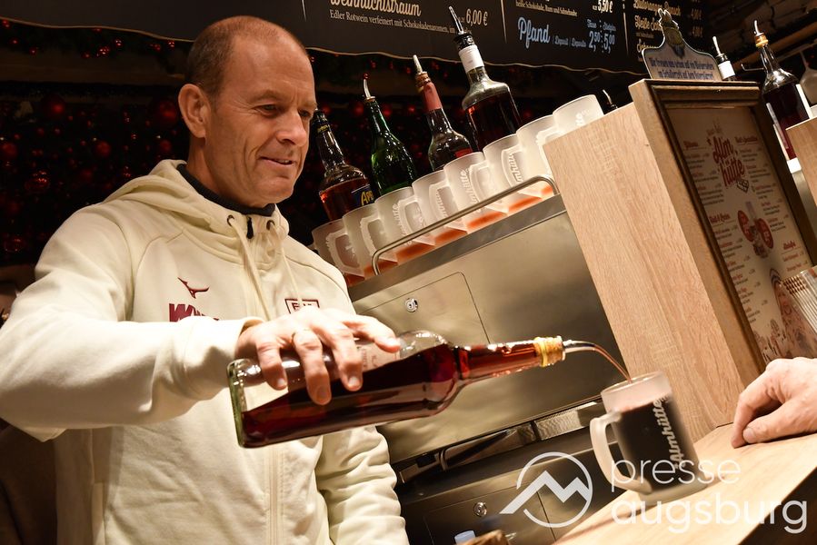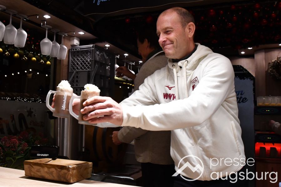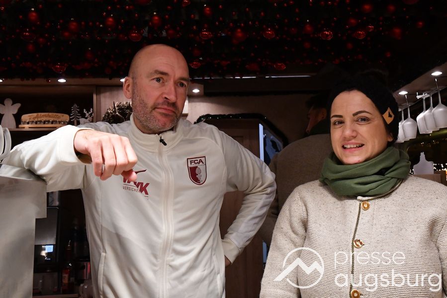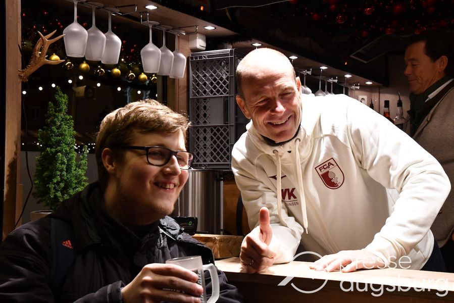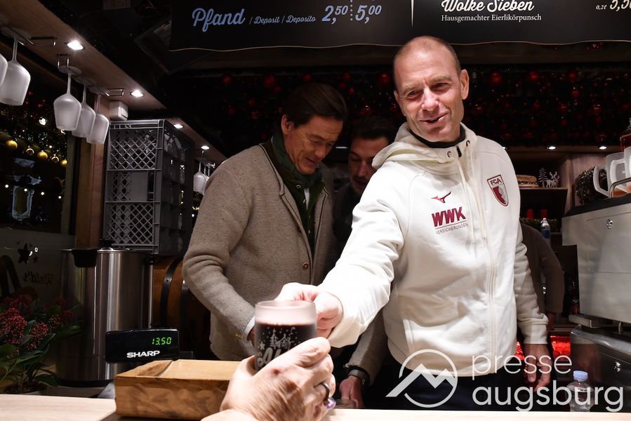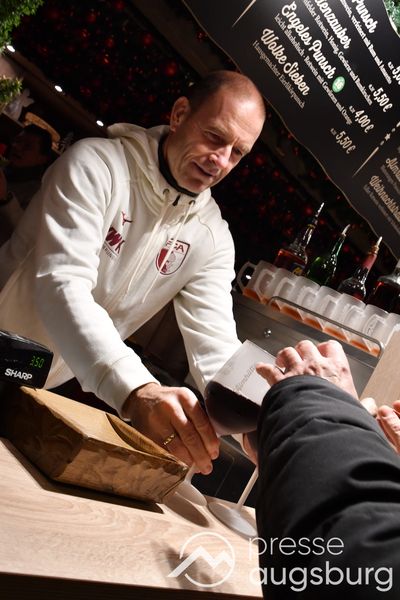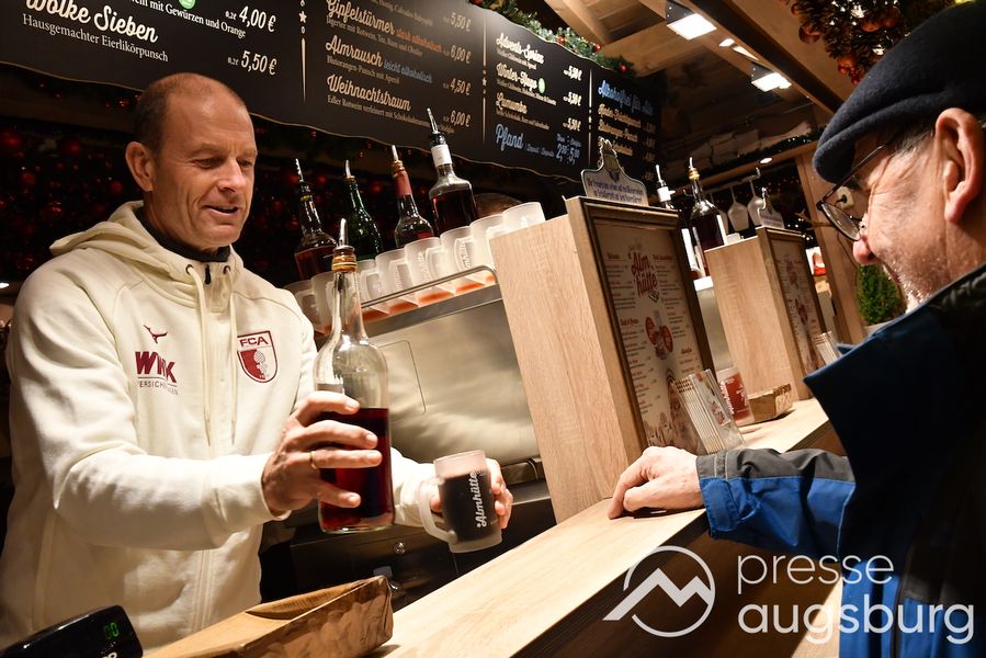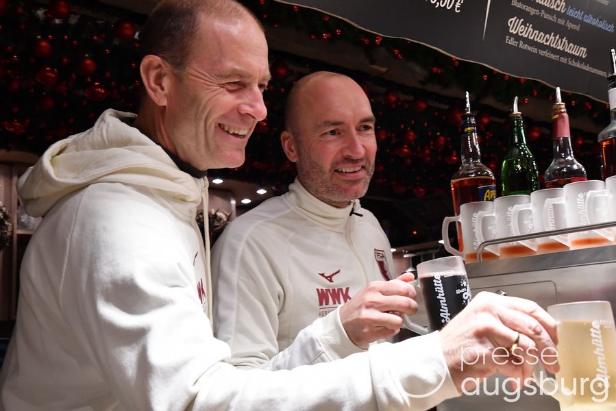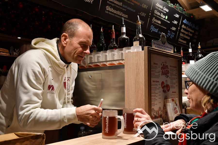 Auch in diesem Jahr engagiert sich der FC Augsburg auf dem Augsburger Christkindlesmarkt und zeigt Herz für die Region. An sechs Terminen schenken Spieler, Funktionäre und Stadionsprecher Rolf Störmann in der Almhütte auf dem Rathausplatz Glühwein und alkoholfreien Punsch für den guten Zweck aus. Am Montag hatten Cheftrainer Jess Thorup und Co-Trainer Jacob Friis die erste Schicht übernommen.
