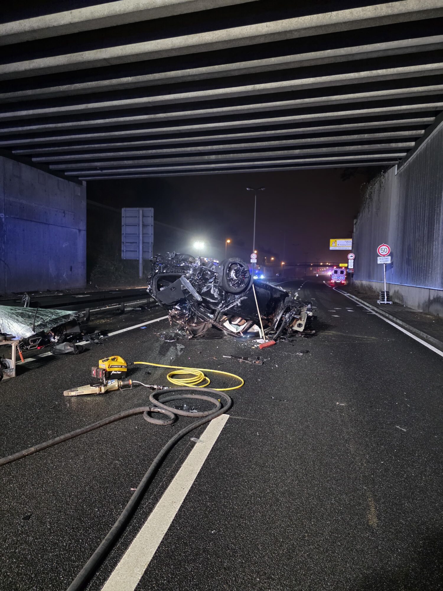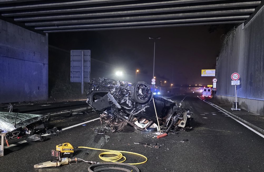 Nach Angaben der Polizei prallte der Wagen zunächst gegen die Mittelleitplanke, schleuderte anschließend über die Fahrbahn und kam schließlich auf der Gegenfahrbahn auf dem Dach zum Liegen. Infolge des Unfalls fing das Fahrzeug Feuer.