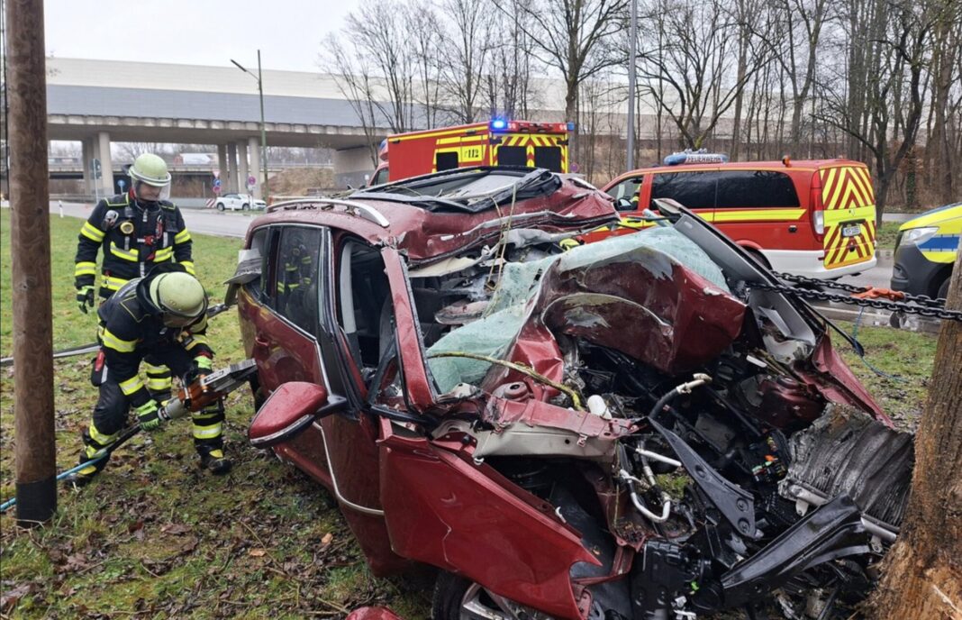 Nach Angaben der Feuerwehr war der Fahrer eines roten VW Touran aus bislang unbekannter Ursache von der Fahrbahn abgekommen und auf Höhe der Auensiedlung frontal mit einem Baum kollidiert.