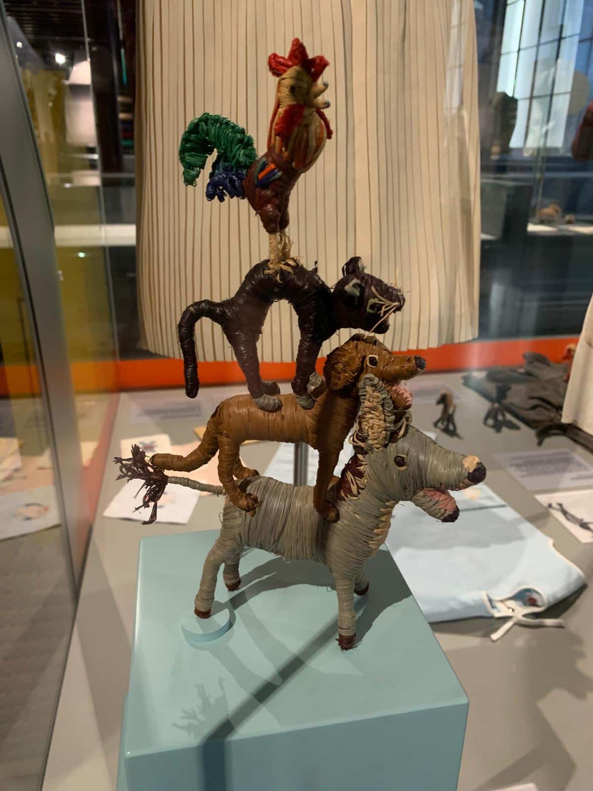 Die Tiere treten im tim mit Objekten der Dauerausstellung in einen augenzwinkernden Dialog. So blickt beispielsweise eine Pinguinfamilie überrascht auf einen schwarz-weißen Hochzeitsfrack oder ein eitler Pfau schlägt sein leuchtendes Rad direkt vor seinem vermeintlichen Konkurrenten, einem schillernden Charleston-Kleid aus den 1920er Jahren. Die 1899 geborene Else Stadler-Jacobs stammte aus einer Pasinger Künstlerfamilie und studierte an der Kunstgewerbeschule in München. Für die angehende Künstlerin spielten Tiere als künstlerisches Motiv von Beginn an eine zentrale Rolle. Ihre Tierdarstellungen zierten Stoffe und Kissenbezüge und sie entwarf textiles Spielzeug, das sie als freie Kunstgewerblerin auf Messen verkaufte. Der große Erfolg stellt sich ein, als sie erstmal 1927 mit Bast als Werkstoff Tiere zur Dekorationszwecken gestaltet. Bereits 1930 war ihr Auftragsbuch mit Bestellungen aus Europa und den USA so gut gefüllt, dass sie sich ausschließlich auf ihre „Bastowerkstatt“ konzentrierte, mit der sie bald nach Aidenried an den Ammersee umzog.