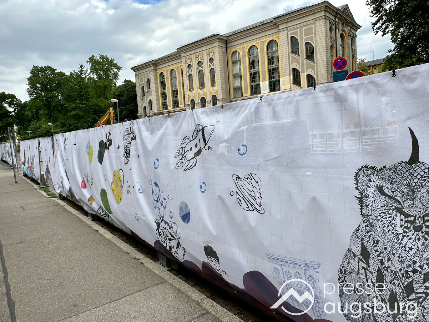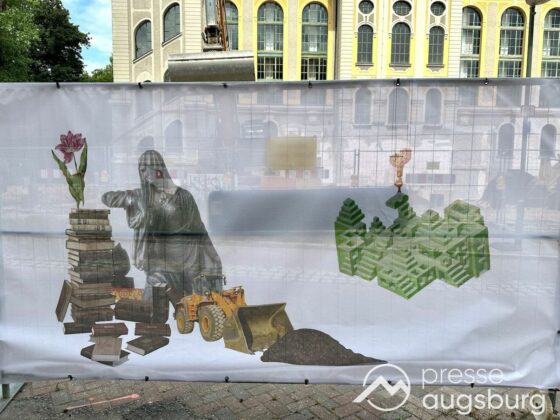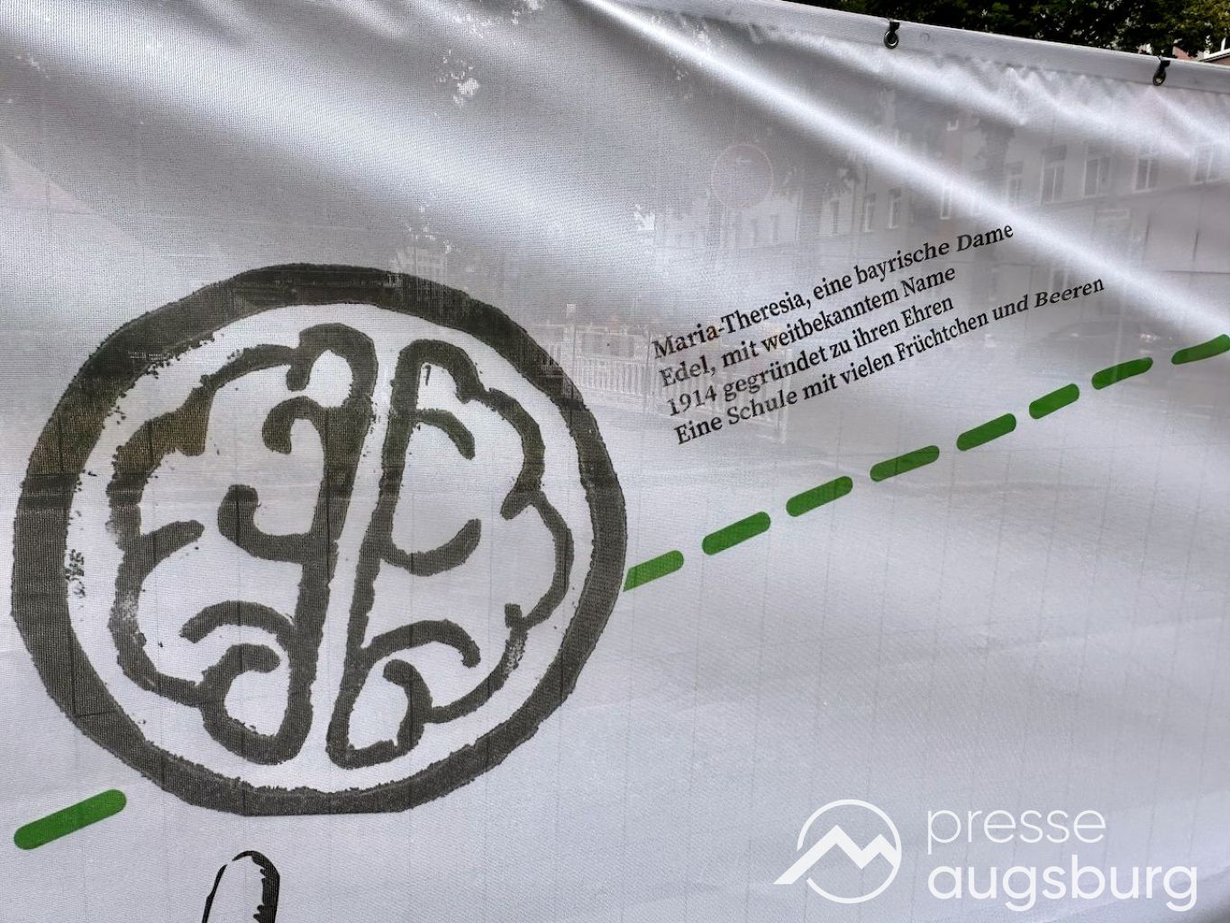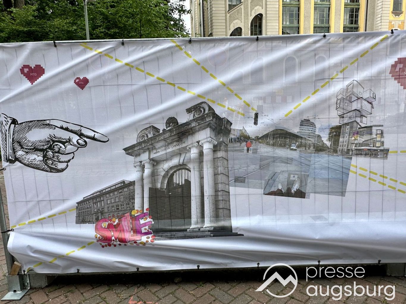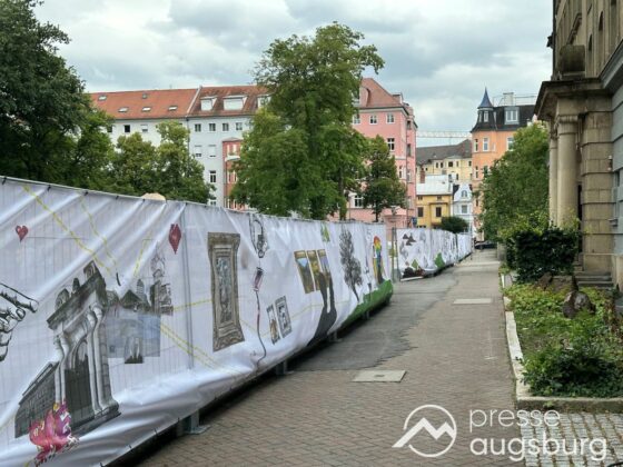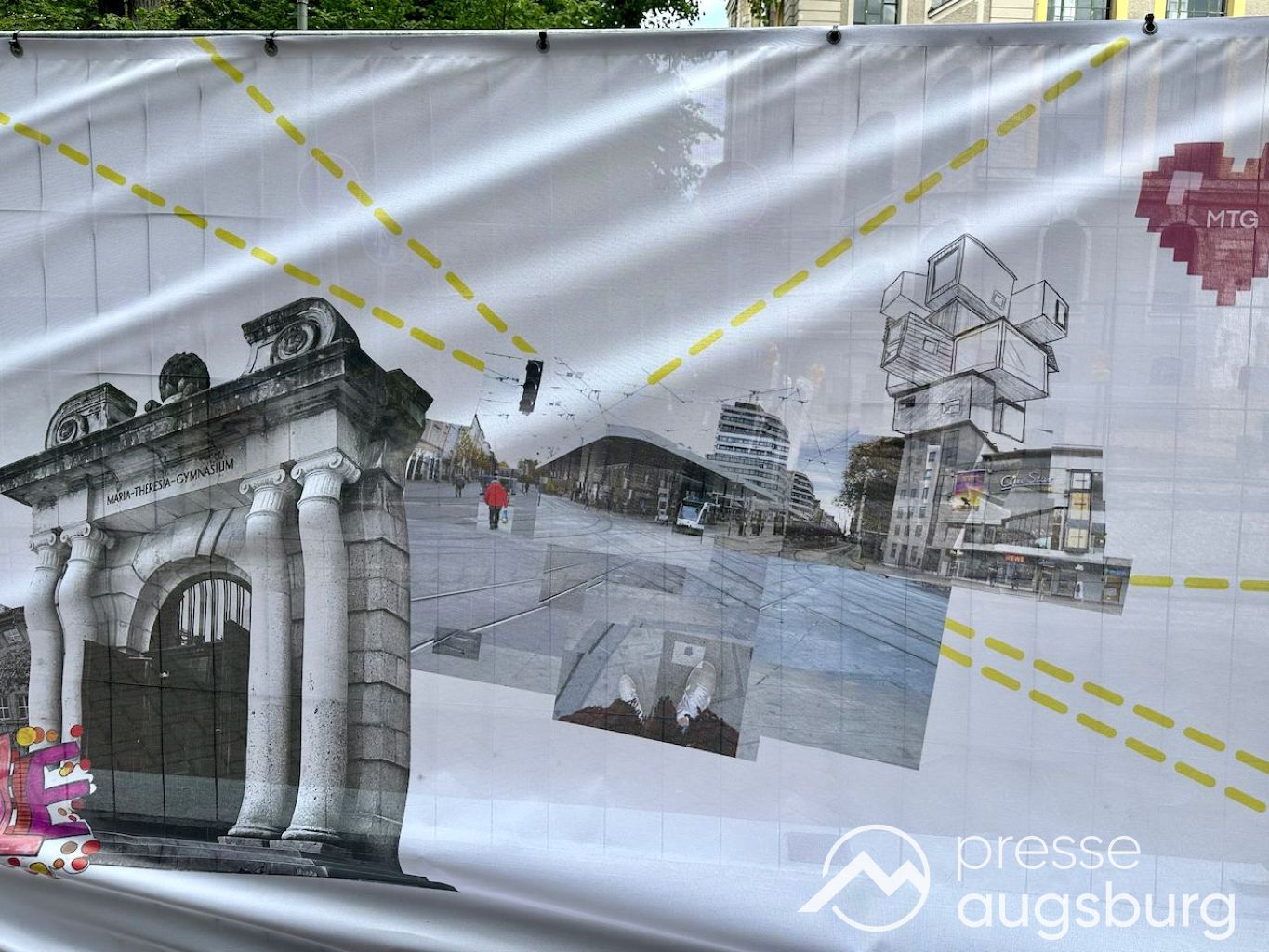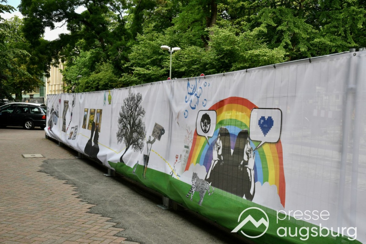 Ein langer Bauzaun steht vor dem Maria-Theresia-Gymnasium Augsburg, um die Schülerinnen vor der nahen Baustelle an der Stadt- und Staatsbibliothek zu schützen. Darstellungen auf Bannern der Metallgitterzäune sind langweilig und oft mit aufdringlicher Werbung bestückt. Nicht so der lange Zaun vor dem MTG, wie die Schule liebevoll genannt wird.