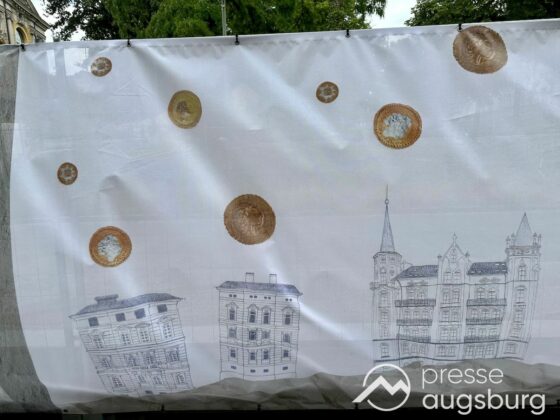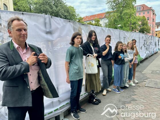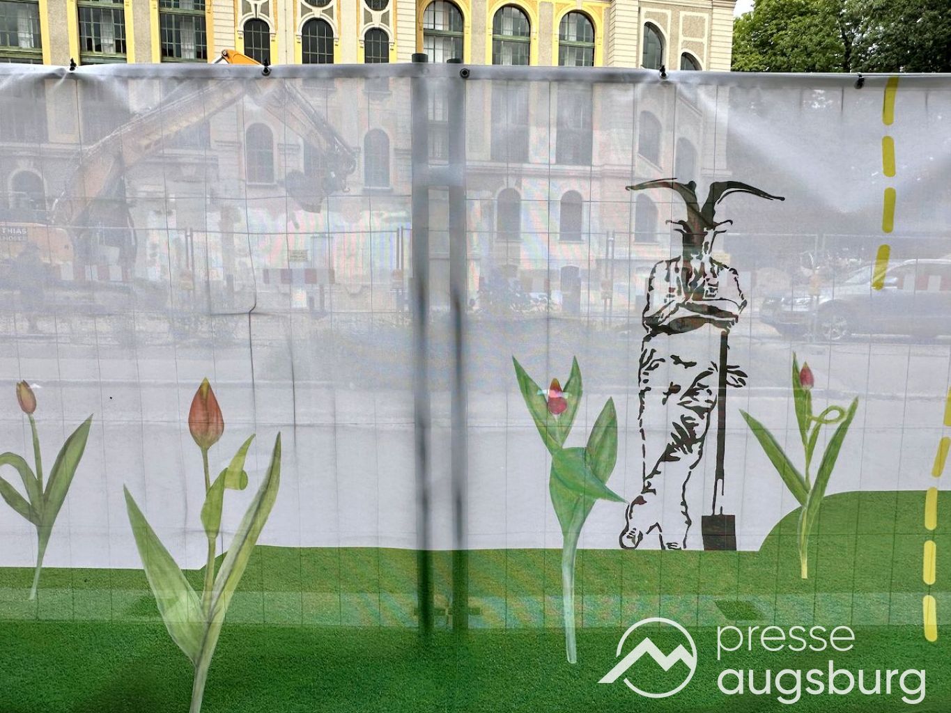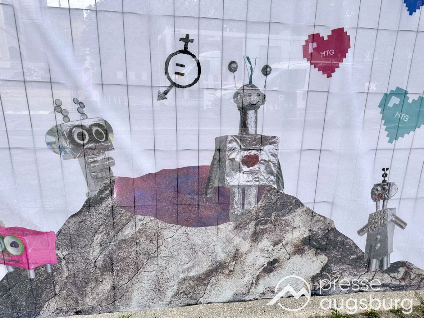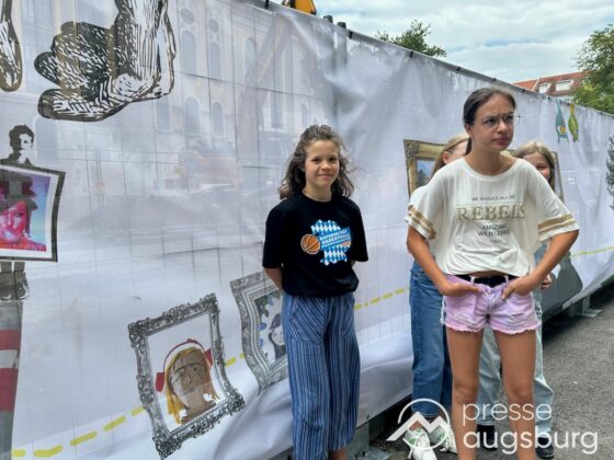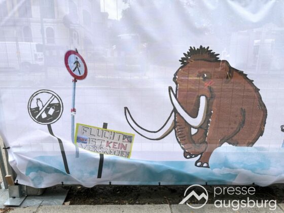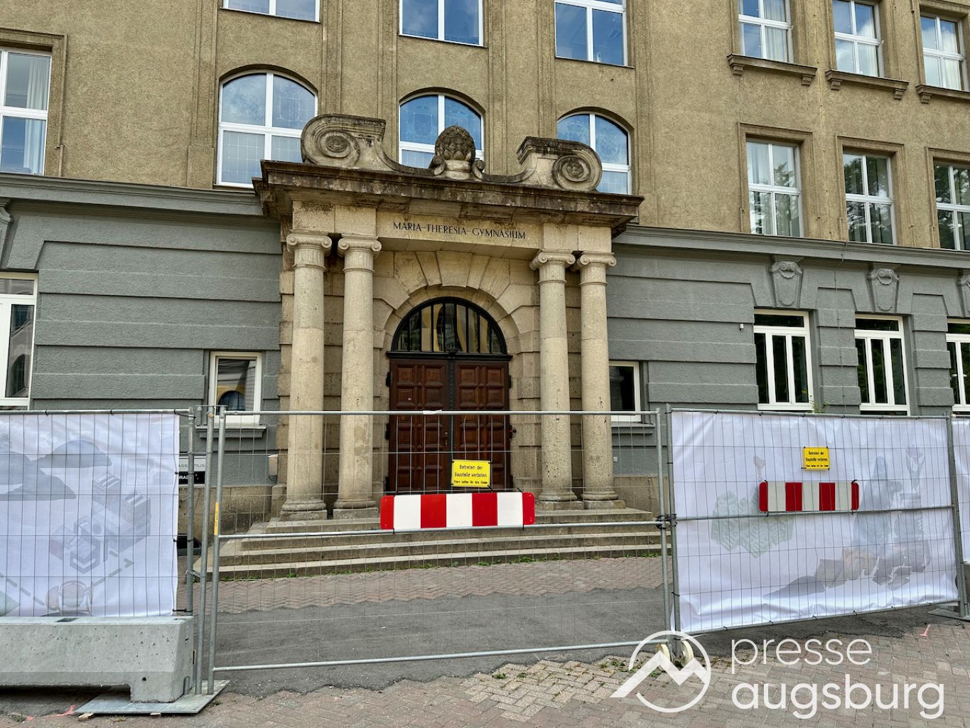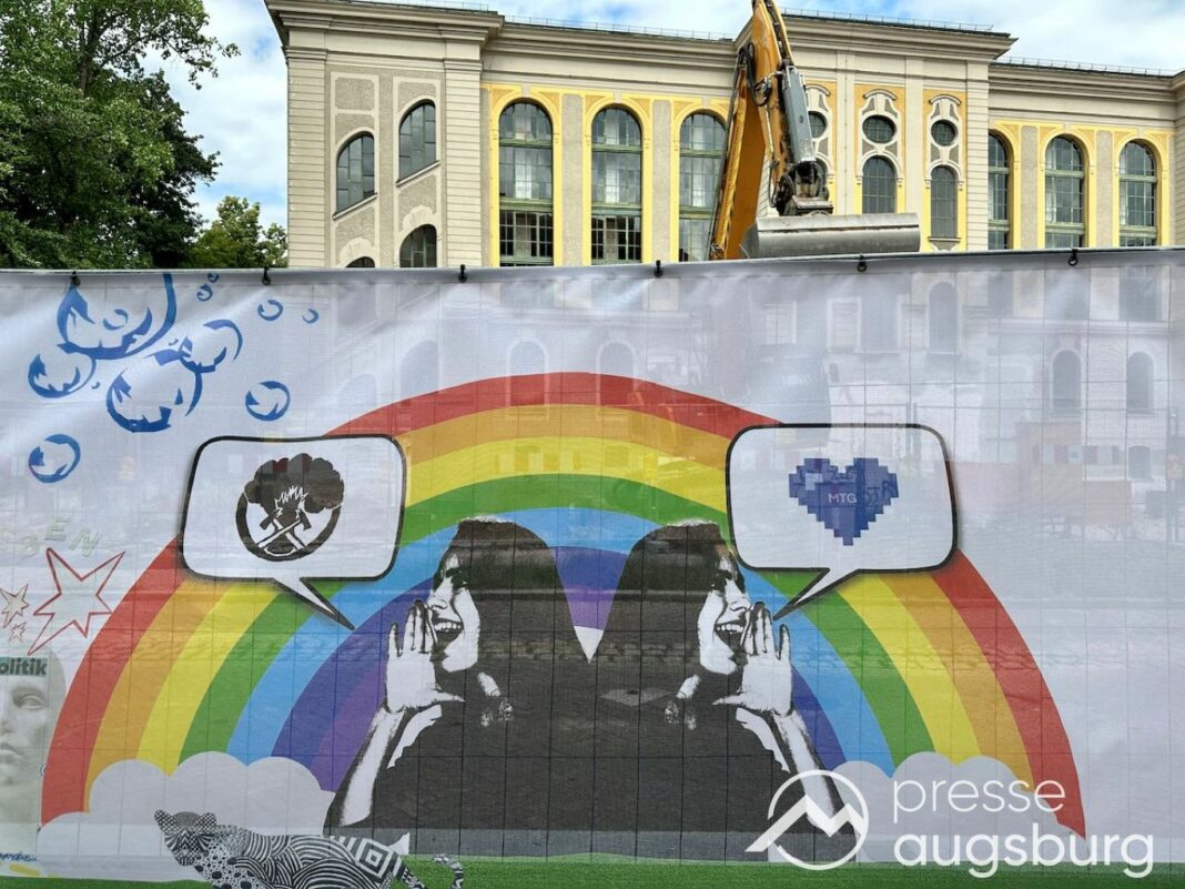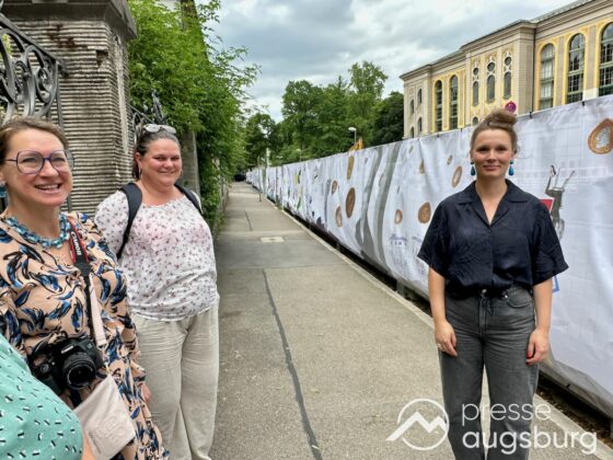 Ein langer Bauzaun steht vor dem Maria-Theresia-Gymnasium Augsburg, um die Schülerinnen vor der nahen Baustelle an der Stadt- und Staatsbibliothek zu schützen. Darstellungen auf Bannern der Metallgitterzäune sind langweilig und oft mit aufdringlicher Werbung bestückt. Nicht so der lange Zaun vor dem MTG, wie die Schule liebevoll genannt wird.