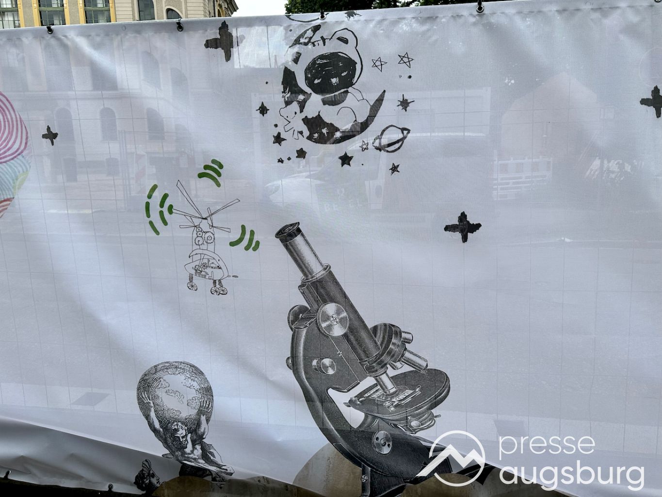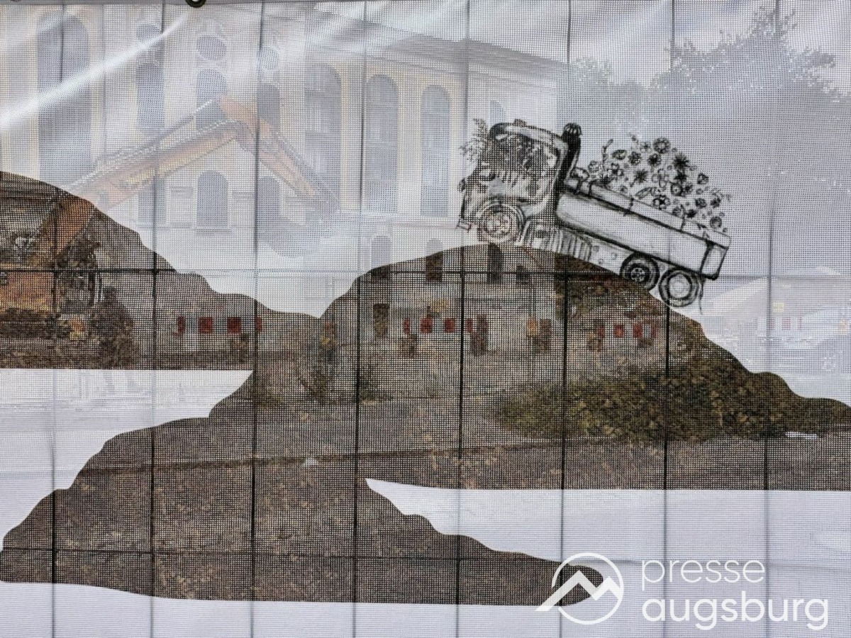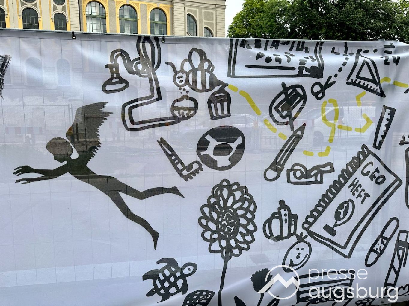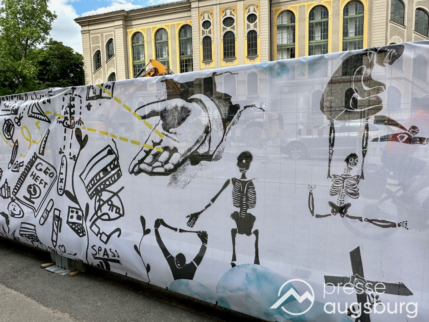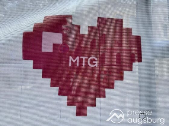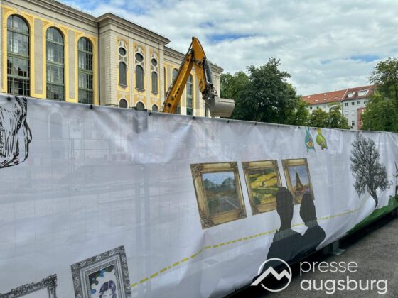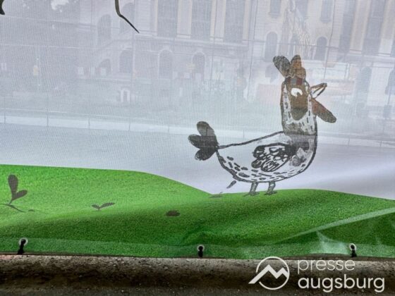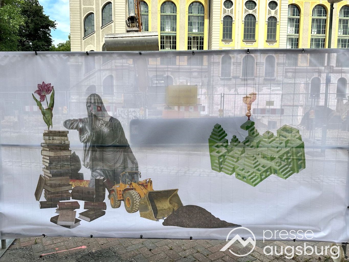 Ein langer Bauzaun steht vor dem Maria-Theresia-Gymnasium Augsburg, um die Schülerinnen vor der nahen Baustelle an der Stadt- und Staatsbibliothek zu schützen. Darstellungen auf Bannern der Metallgitterzäune sind langweilig und oft mit aufdringlicher Werbung bestückt. Nicht so der lange Zaun vor dem MTG, wie die Schule liebevoll genannt wird.