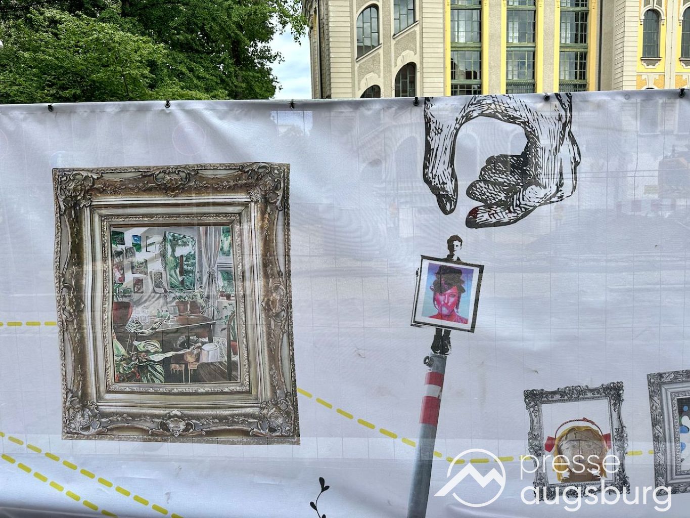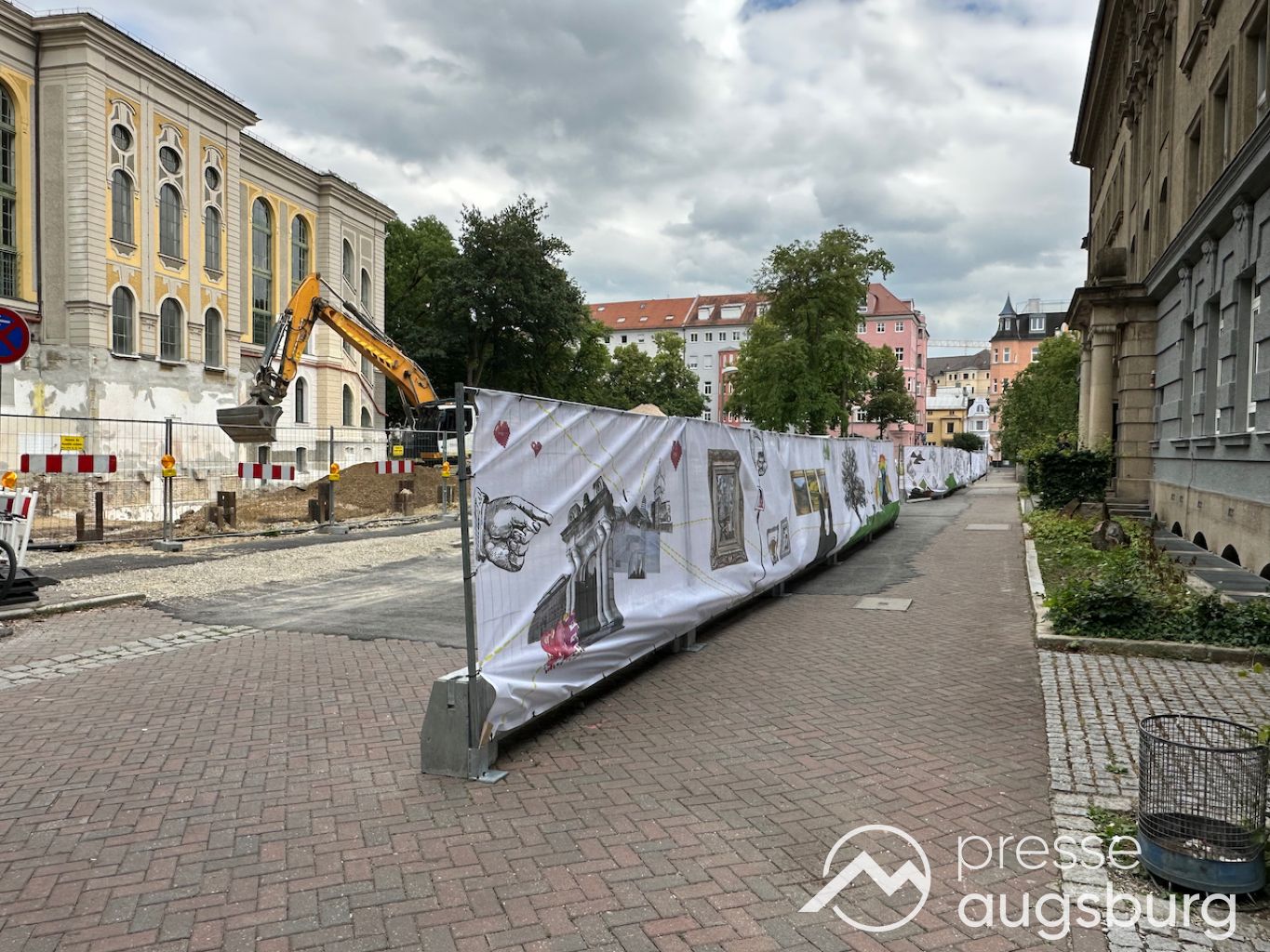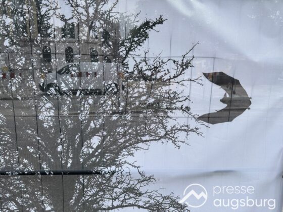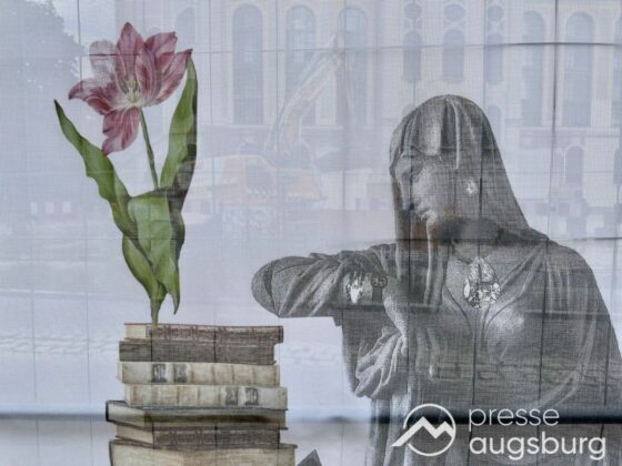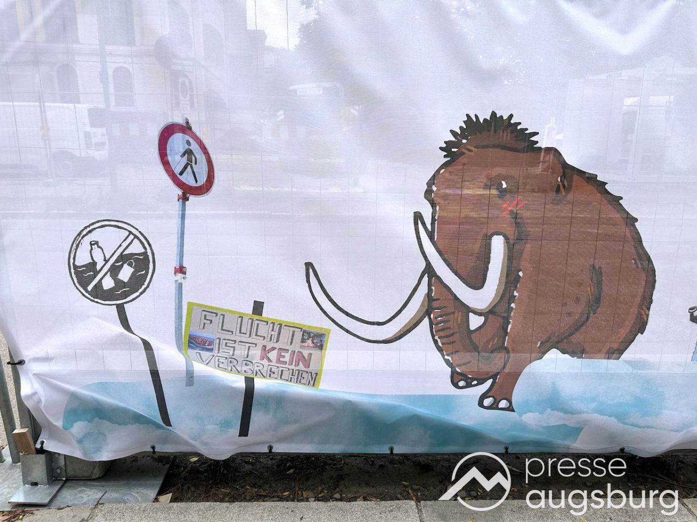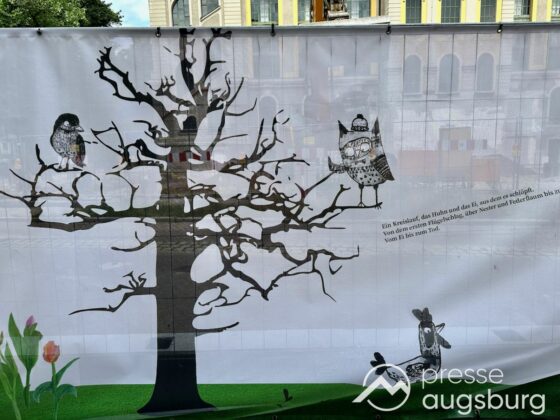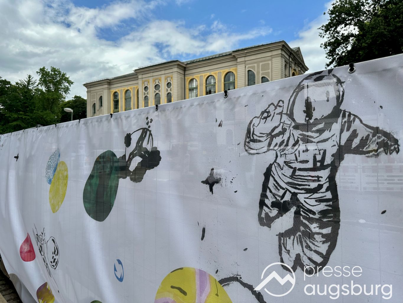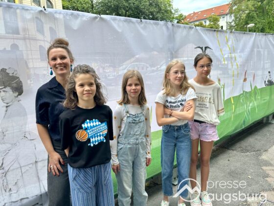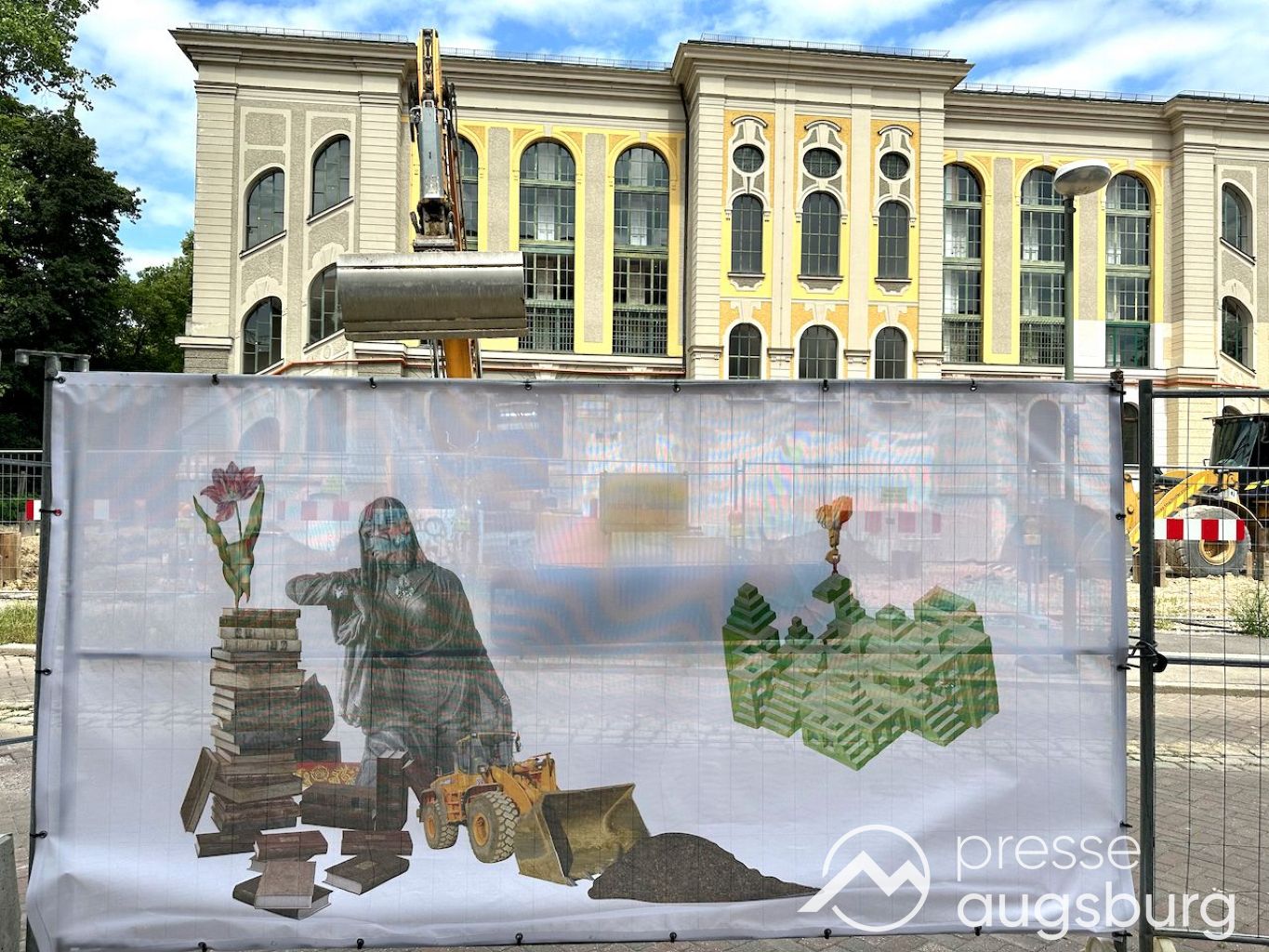 Ein langer Bauzaun steht vor dem Maria-Theresia-Gymnasium Augsburg, um die Schülerinnen vor der nahen Baustelle an der Stadt- und Staatsbibliothek zu schützen. Darstellungen auf Bannern der Metallgitterzäune sind langweilig und oft mit aufdringlicher Werbung bestückt. Nicht so der lange Zaun vor dem MTG, wie die Schule liebevoll genannt wird.