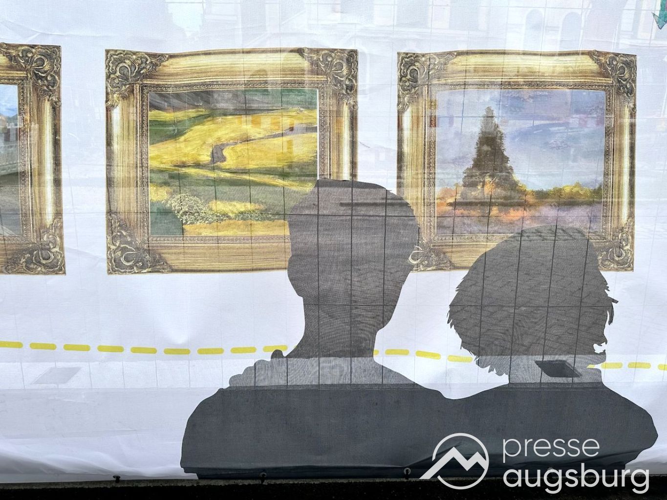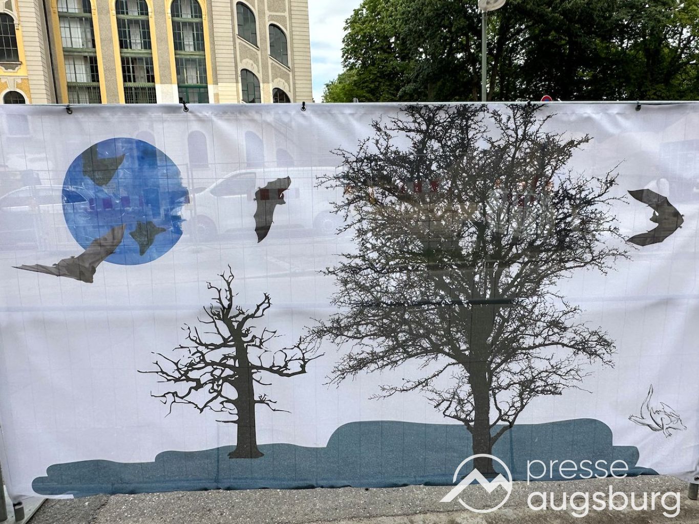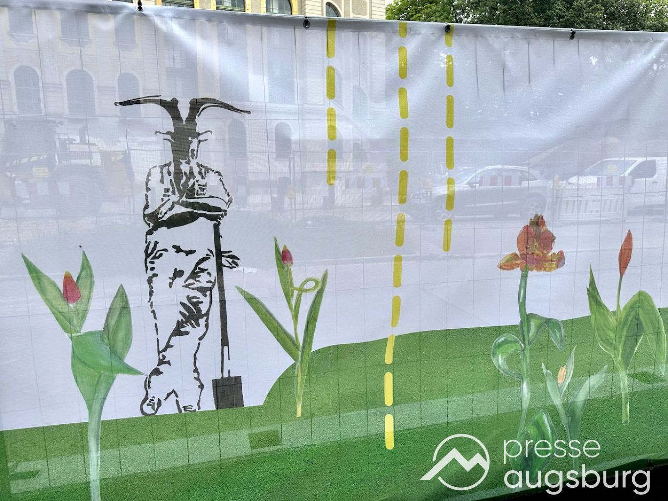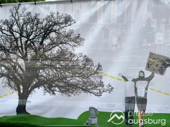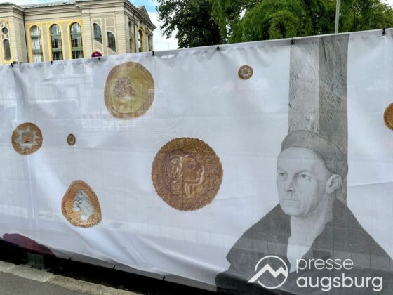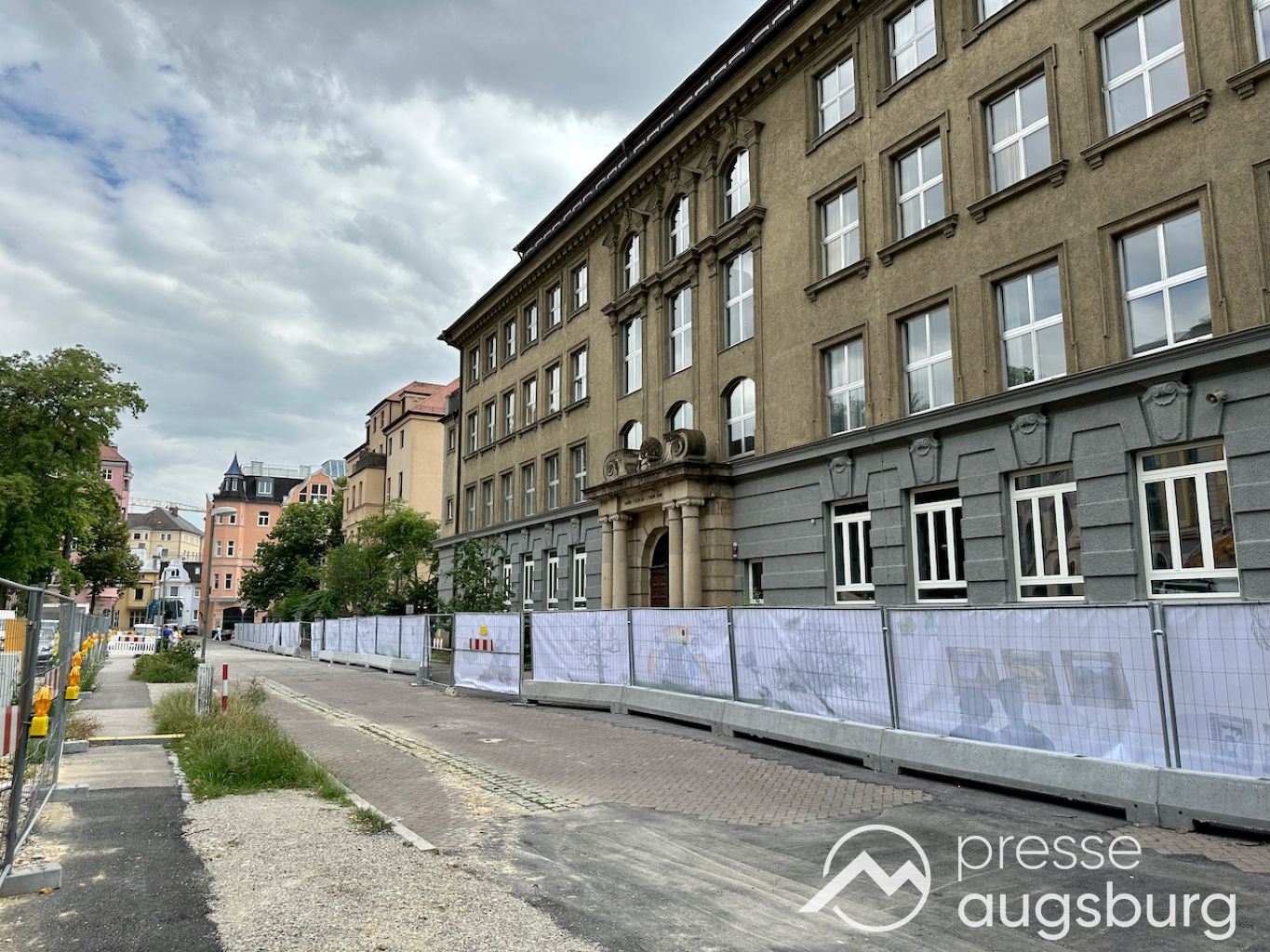 Ein langer Bauzaun steht vor dem Maria-Theresia-Gymnasium Augsburg, um die Schülerinnen vor der nahen Baustelle an der Stadt- und Staatsbibliothek zu schützen. Darstellungen auf Bannern der Metallgitterzäune sind langweilig und oft mit aufdringlicher Werbung bestückt. Nicht so der lange Zaun vor dem MTG, wie die Schule liebevoll genannt wird.