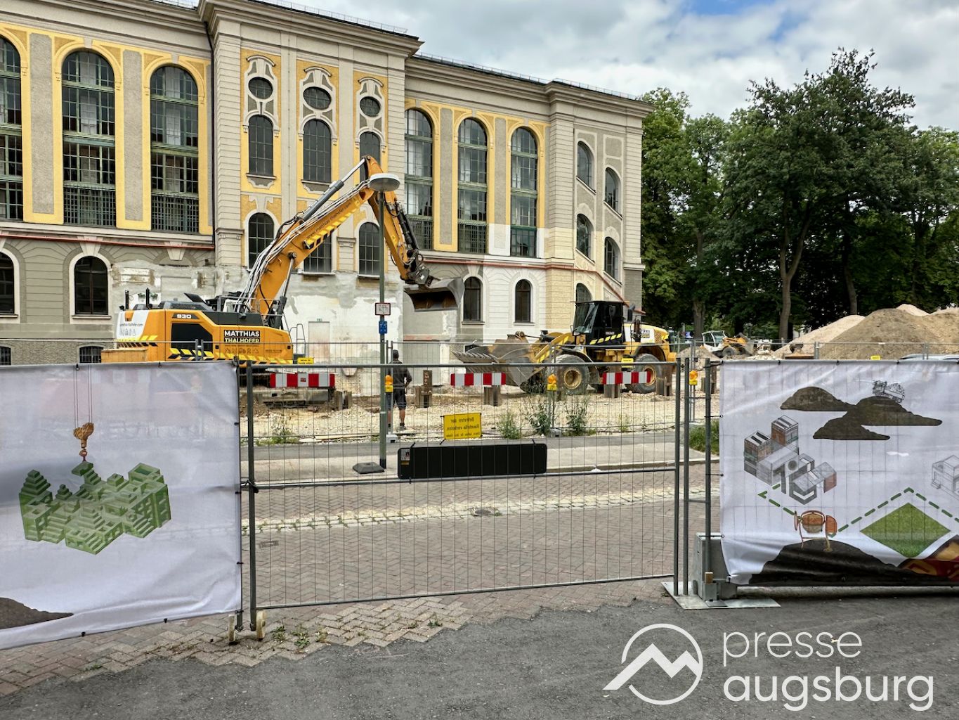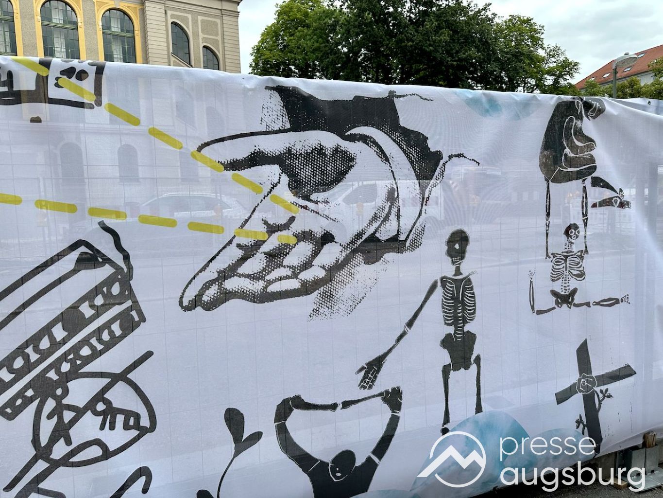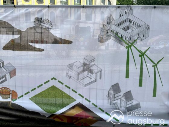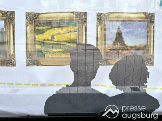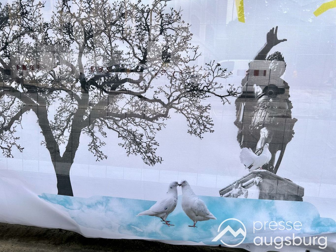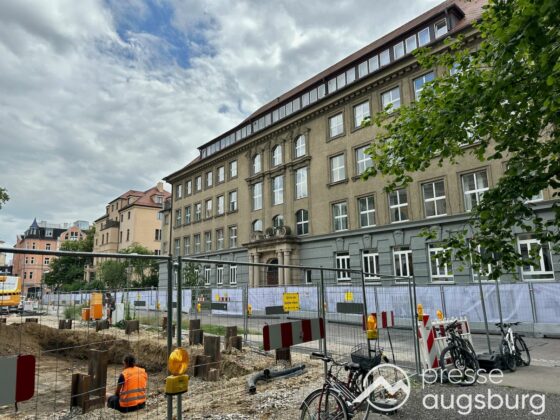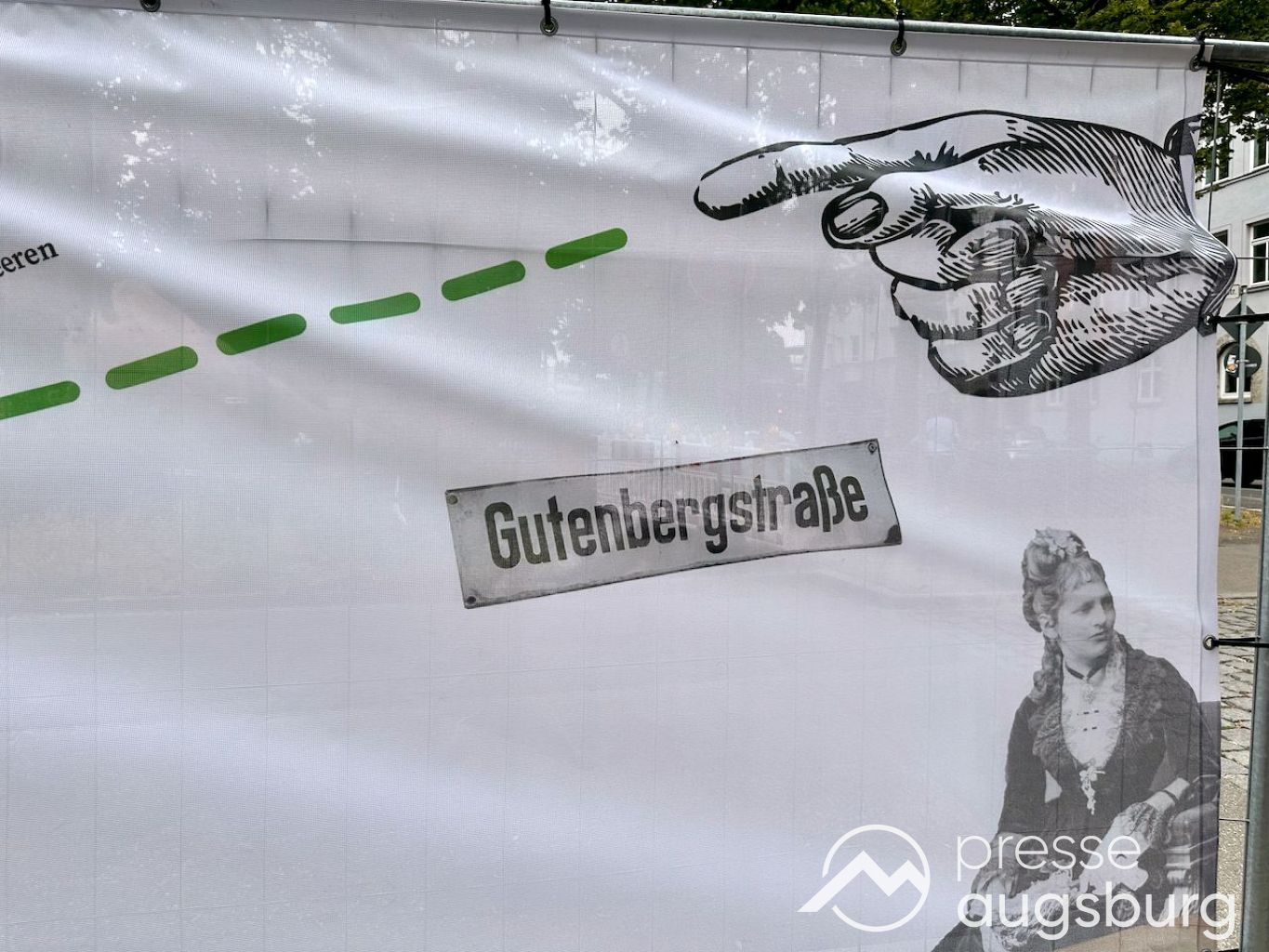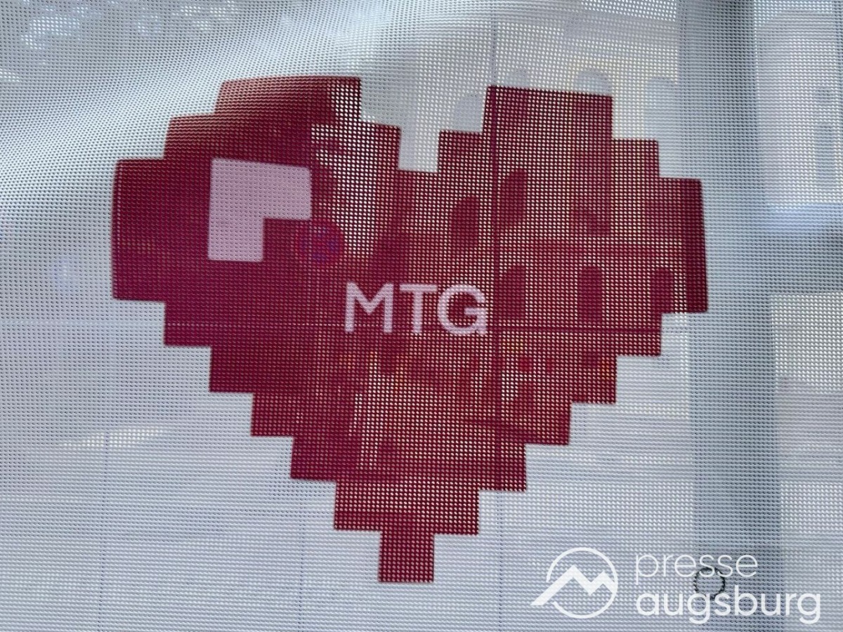 Ein langer Bauzaun steht vor dem Maria-Theresia-Gymnasium Augsburg, um die Schülerinnen vor der nahen Baustelle an der Stadt- und Staatsbibliothek zu schützen. Darstellungen auf Bannern der Metallgitterzäune sind langweilig und oft mit aufdringlicher Werbung bestückt. Nicht so der lange Zaun vor dem MTG, wie die Schule liebevoll genannt wird.