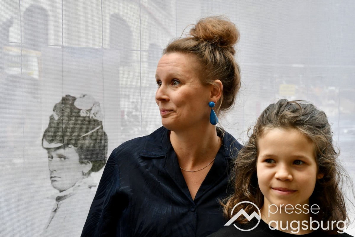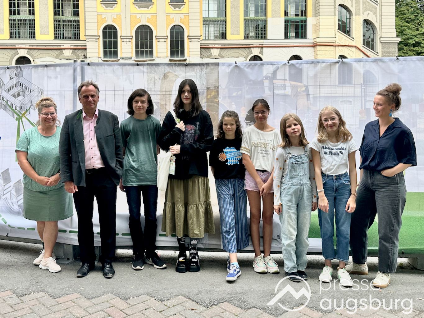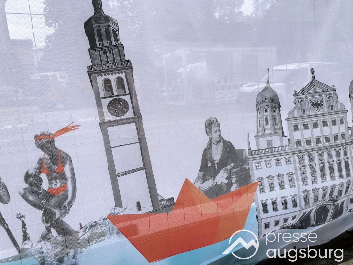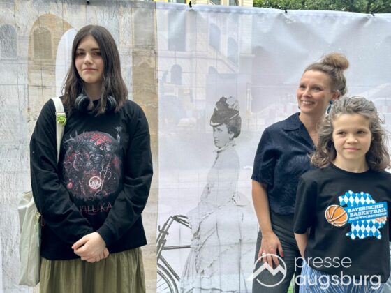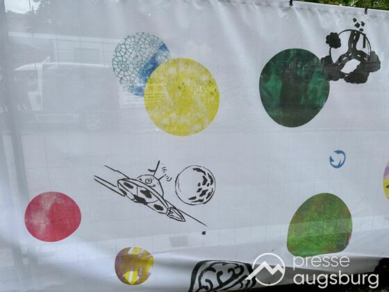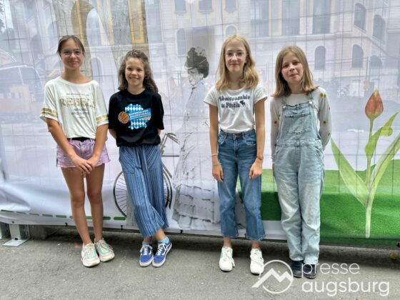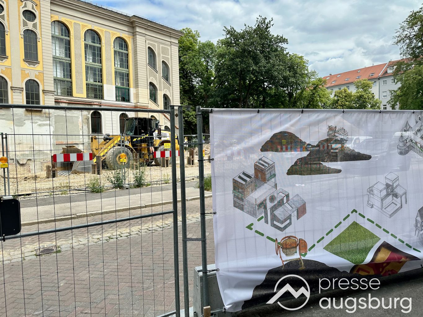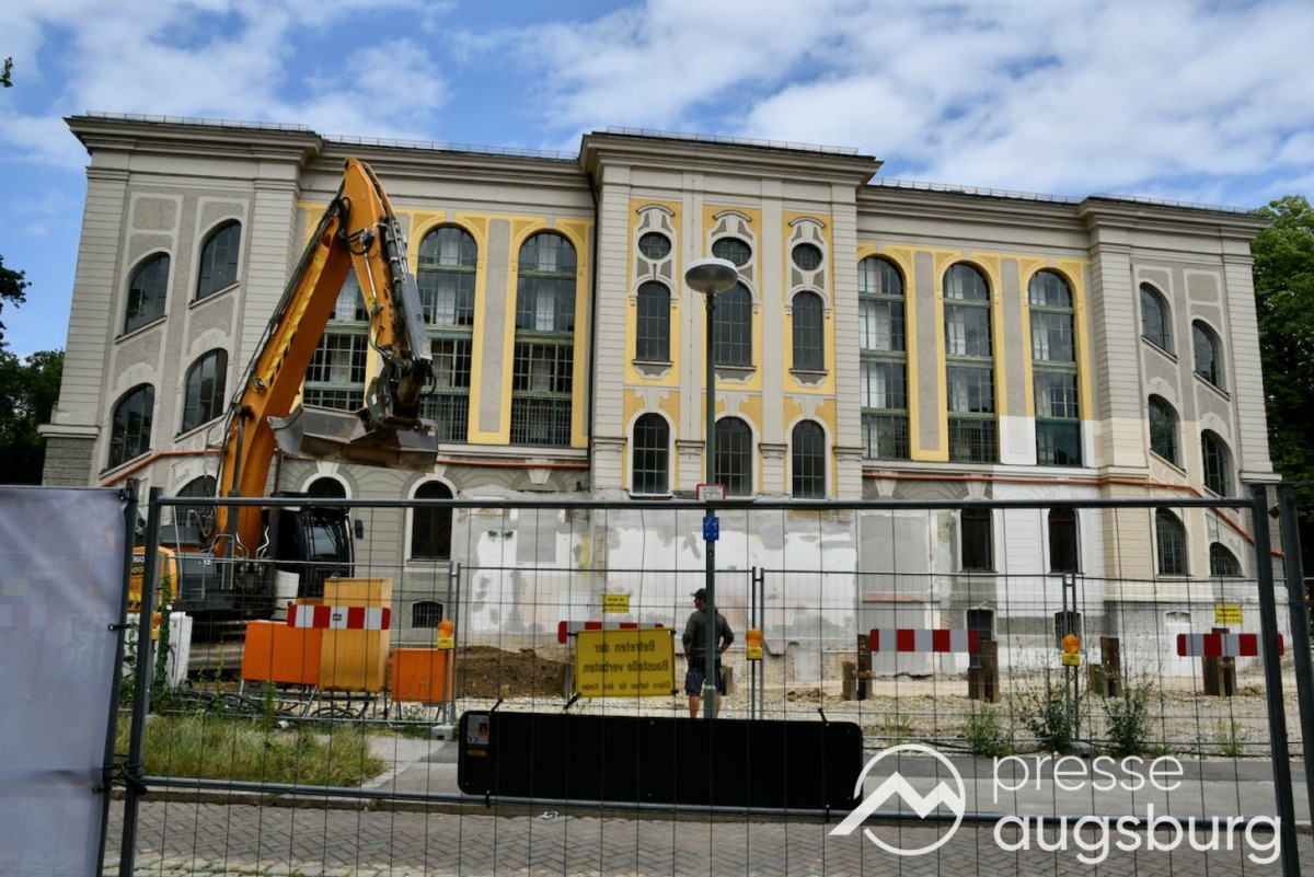 Ein langer Bauzaun steht vor dem Maria-Theresia-Gymnasium Augsburg, um die Schülerinnen vor der nahen Baustelle an der Stadt- und Staatsbibliothek zu schützen. Darstellungen auf Bannern der Metallgitterzäune sind langweilig und oft mit aufdringlicher Werbung bestückt. Nicht so der lange Zaun vor dem MTG, wie die Schule liebevoll genannt wird.