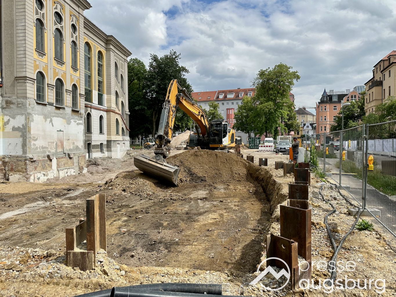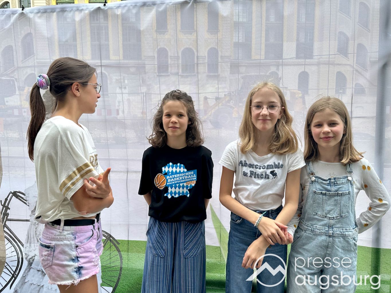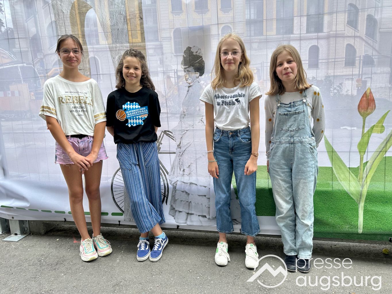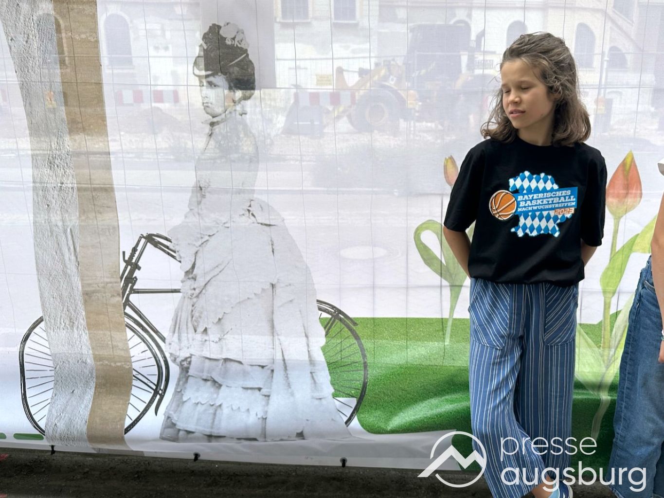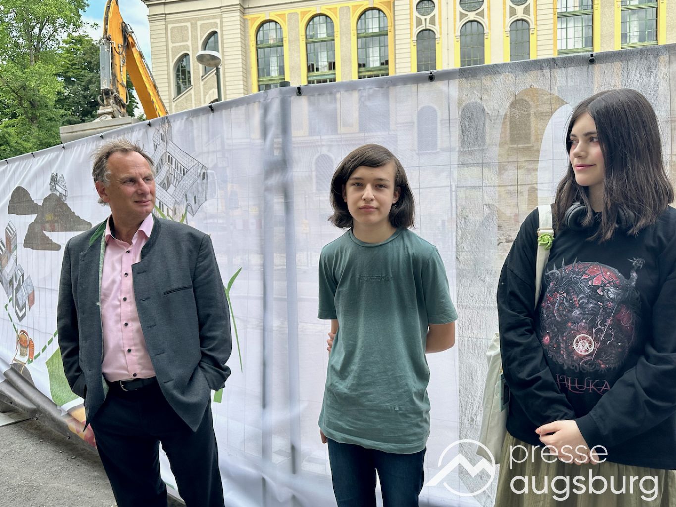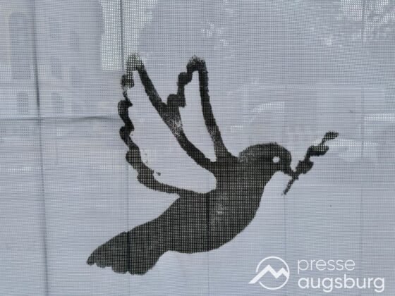 Ein langer Bauzaun steht vor dem Maria-Theresia-Gymnasium Augsburg, um die Schülerinnen vor der nahen Baustelle an der Stadt- und Staatsbibliothek zu schützen. Darstellungen auf Bannern der Metallgitterzäune sind langweilig und oft mit aufdringlicher Werbung bestückt. Nicht so der lange Zaun vor dem MTG, wie die Schule liebevoll genannt wird.
